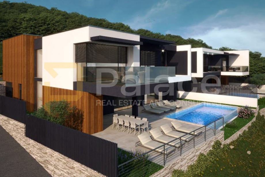 Cijelo južno pročelje vile izvedeno je u staklenim stijenkama visine 3,10 m s Schüco ALU profilima, pružajući maksimalnu količinu prirodnog svjetla i neometan pogled na more i otoke.Vila je opremljena suvremenim i vrhunskim tehničkim rješenjima:• DAIKIN dizalica topline• Kompletna DAIKIN linijska klimatizacija• Podno grijanje na obje etaže• Talijanske pločice 1. klase velikog formata• Alarmni sustav i video nadzor objekta i okućnice• Protuprovalne ALU žaluzine skrivene u fasadi• Bazen s keramičkom oblogom velikog formata, sustavom elektrolize i pH kontrolera, Fluvo profesionalnim masažnim mlaznicama (za 3 osobe), full inverter toplinskom pumpom (grijanje vode) te ambijentalnom LED rasvjetom u boji• Unutarnja vrata modernog dizajna, staklene ograde na terasama, automatska klizna vrata za ulazak na posjed, automatska sekcijska garažna vrata te ostala oprema vrhunske kvalitete…Vila je građena i opremljena u skladu sa standardima luksuzne turističke kategorizacije 5 zvjezdica, te predstavlja idealnu priliku za privatno uživanje, turistički najam ili investiciju.Prodaju se 3 identična objekta od kojih će Vila br. 1 biti useljiva u prvom kvartalu 2026. godine, Vila br. 2 pred kraj 2026. godine te Vila br. 3 sredinom 2027 godine.