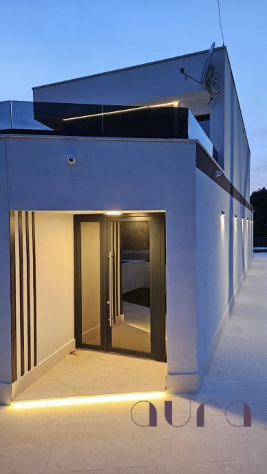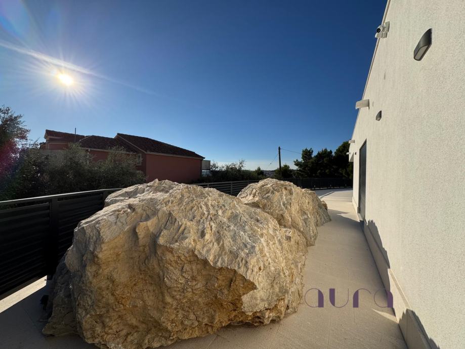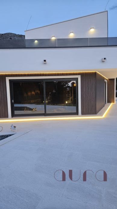 Posredujemo u dugoročnom najmu prekrasne luksuzne Vile na dva kata ukupne stambene površine 180m2 sa okućnicom 650m2. Vila se sastoji od tri spavaće sobe od kojih svaka ima svoje kupatilo sa wc-om, velikog dnevnog boravka spojenog sa blagovaonom i kuhinjom. U prizemlju je velika terasa sa bazenom i pogledom na more. Na katu je također terasa sa otvorenim pogledom na more. Ispred Vile je garaža i parking za 6 automobila. Ispred objekta uskoro dolazi ljetna kuhinja sa roštiljem.