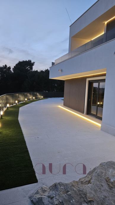 We mediate in the long-term rental of a beautiful luxury villa on two floors with a total living area of 180m2 with a garden of 650m2. The villa consists of three bedrooms, each of which has its own bathroom with toilet, a large living room connected to the dining room and kitchen. On the ground floor there is a large terrace with a pool and a view of the sea. There is also a terrace on the first floor with an open view of the sea. In front of the Villa is a garage and parking for 6 cars. A summer kitchen with a barbecue will soon be located in front of the building.