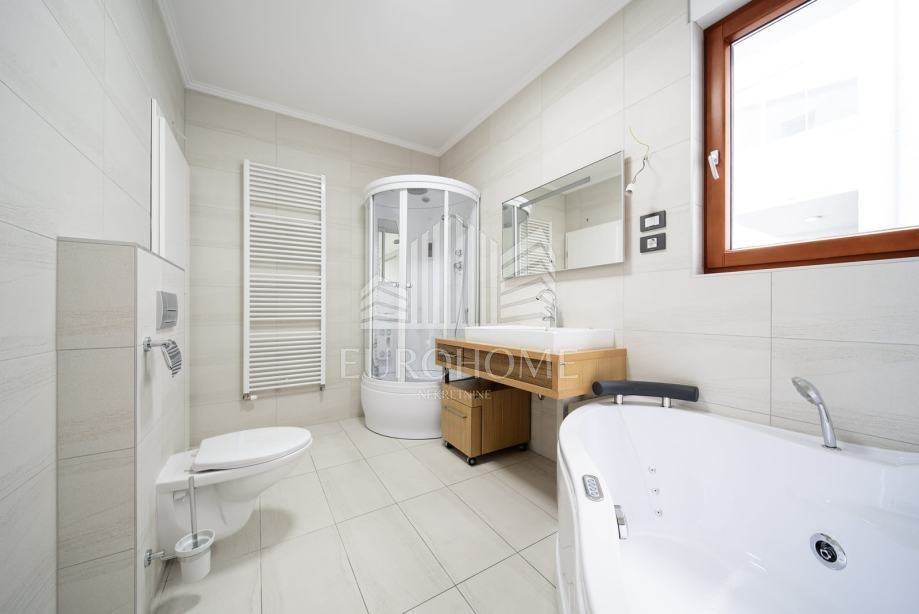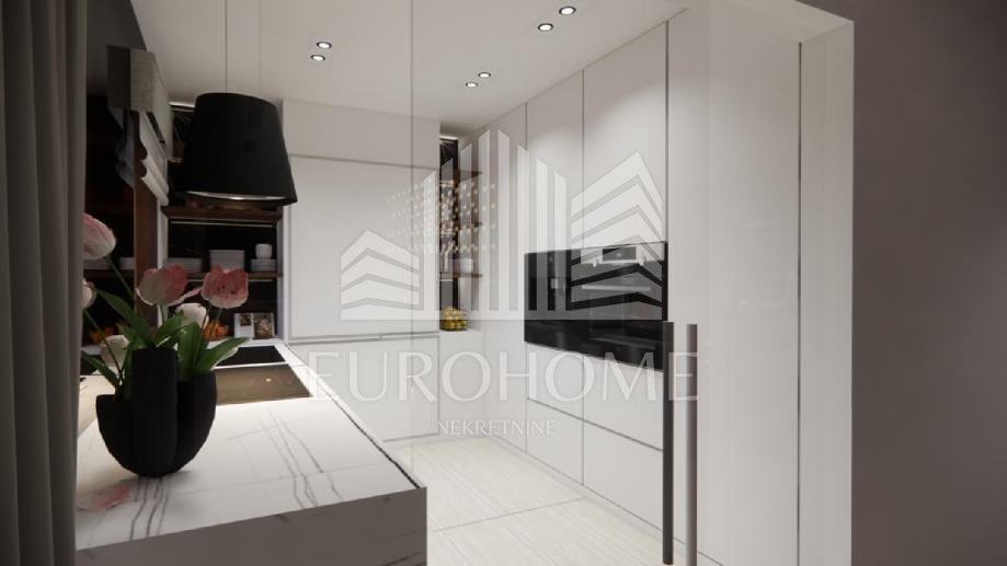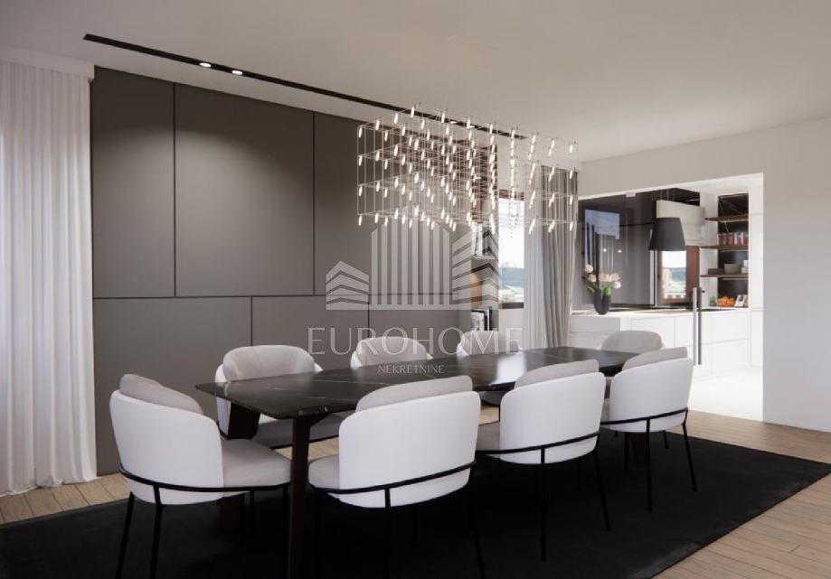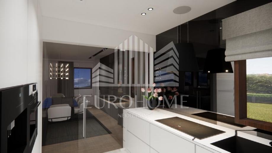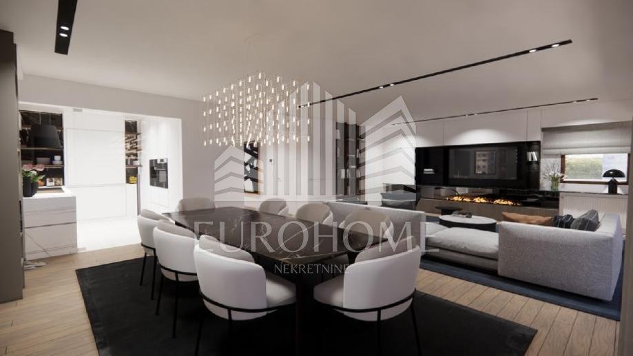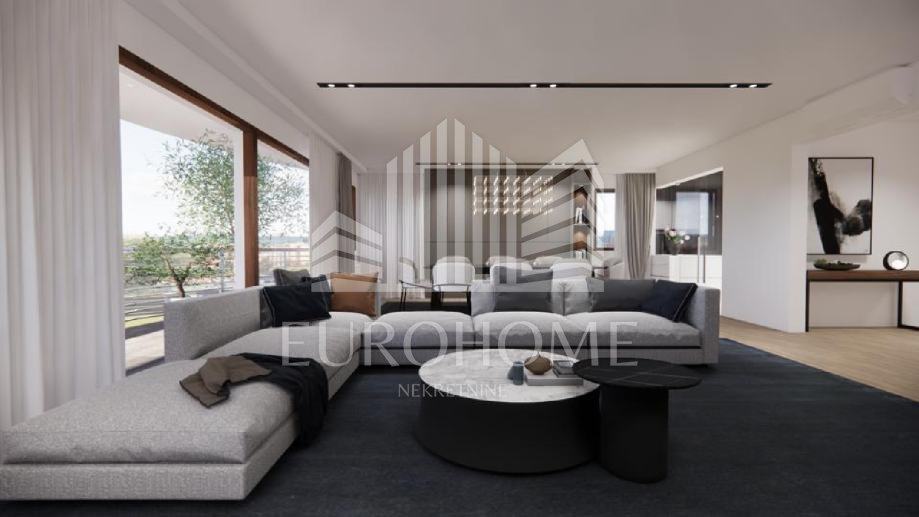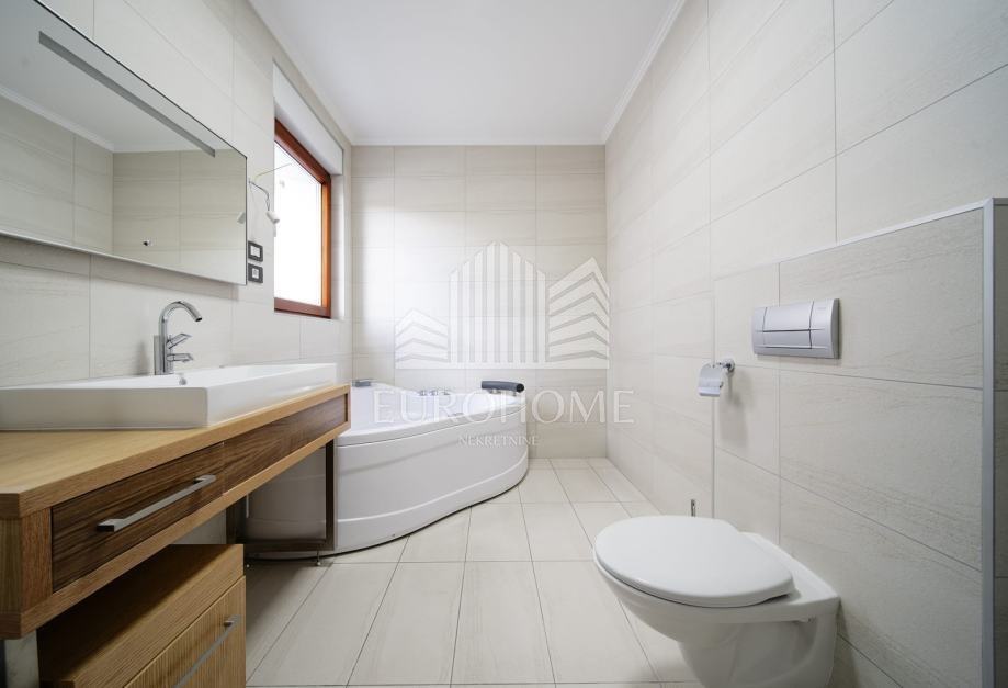 1. katu i uvučenom katu, koji se sastoji od: ulaza, halla, degažmana, dnevnog boravka s blagovaonicom, kuhinje, izbe, četiri sobe, dvije kupaonice, wc-a, vešeraja, stepenica, hodnika, ukupne površine 153,38 m2, s balkonom površine 14,38 m2, terasom površine 34,00 m2, te pripadaka garažnog parkirališnog mjesta GM2 u suterenu površine 34,40 m2 i vrta V1 površine 133,50 m2, sveukupne površine zatvorenih i otvorenih dijelova 369,66 m2.