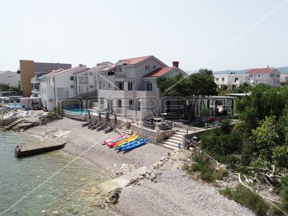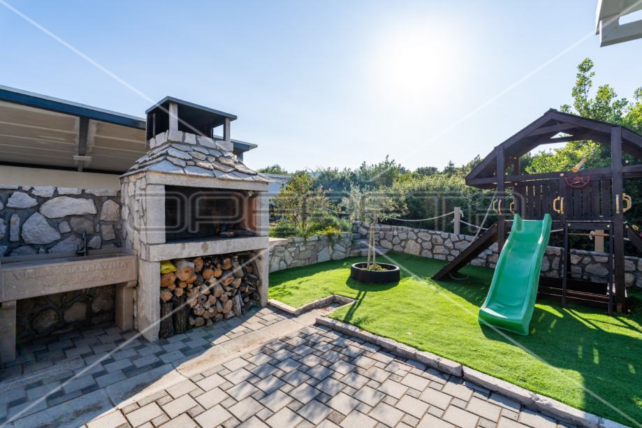 U sklopu kuće, doslovno na samoj plaži nalazi se vanjski bazen i jacuzzi. Tihim i lijepo raspoređenim vanjskim terasama i balkonima kojih ukupno ima 6, svaki apartmanima ima svoj izlaz na terasu ili balkon, dobiva se savršeni sklad mira i pogleda koji je neponovljiv. Kuća ima prelijepi dio sa sjenicom i roštiljem te prostorom za zabavu za najmlađe. Na malom dječjem igralištu, kao i travnatom nogometnom igralištu zagarantirano je maksimalno uživanje tijekom cijelog dana. Osiguran je i praktičan parking za pet automobila.