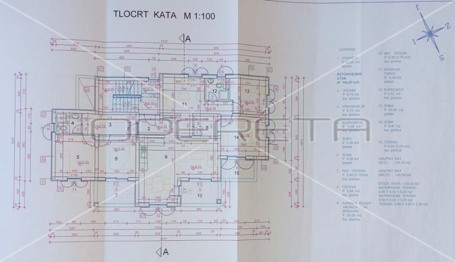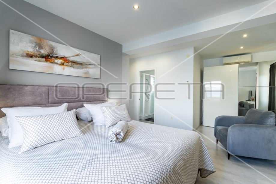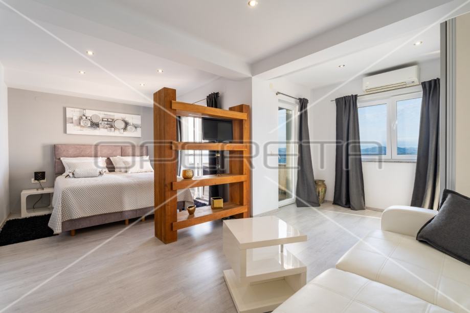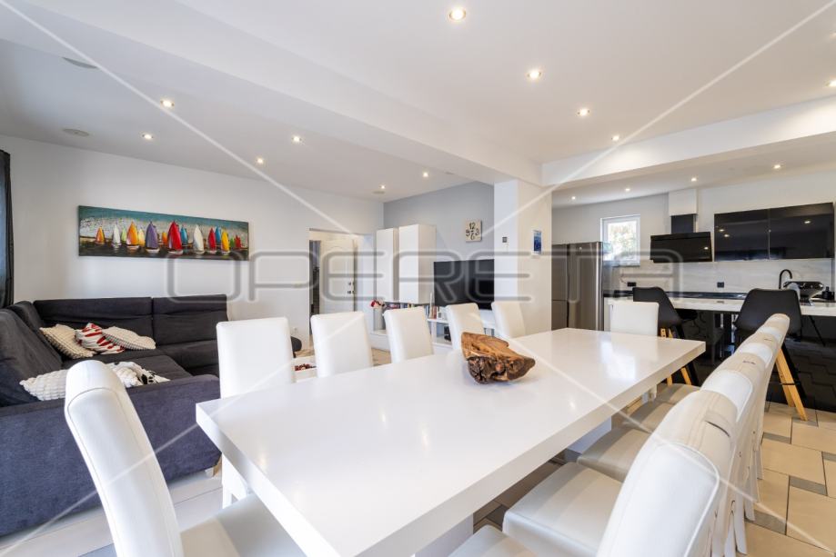 PRIZEMLJE: prostran dnevni boravak i kompletno opremljena kuhinja, jedna soba s kupaonicom, fitness soba i velika kupaonica. KAT: unutarnje stepenište , tri prostrane sobe od kojih je svaka s vlastitim dnevnim boravkom i kupaonicom.