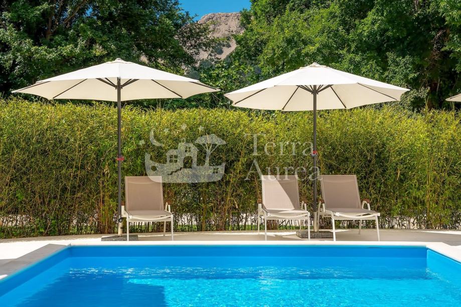 U vanjskom dijelu vile, okružen ležaljkama i suncobranima nalazi se bazen u kojem svakog dana možete potražiti osvježenje uživajući u potpunoj privatnosti te ćete se u ovome dijelu nekretnine osjećati kao u mediteranskoj oazi.