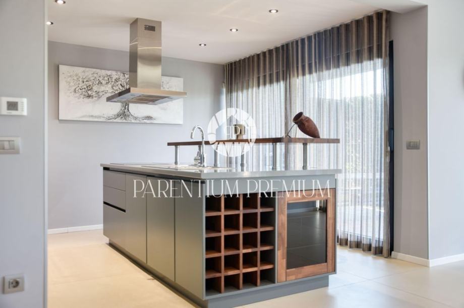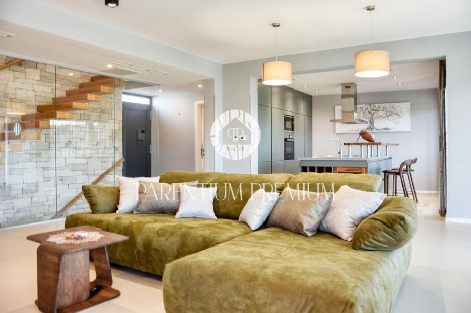 U prizemlju se prostire prostrani otvoreni dnevni boravak s kuhinjom i blagovaonicom, opremljen vrhunskim dizajnerskim namještajem.