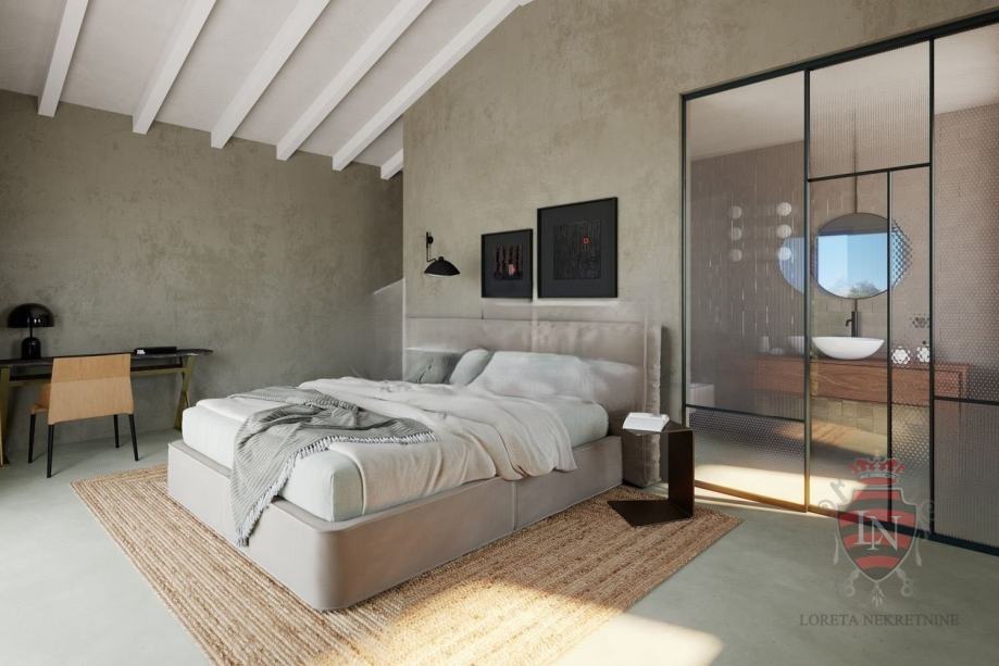 Specifičan dizajn interijera obilježila je svijetla boja zidova uz prirodne materijale poput prirodnog istarskog kamena i drva, a pod je obložen visokokvalitetnim parketom i mikrocementom.