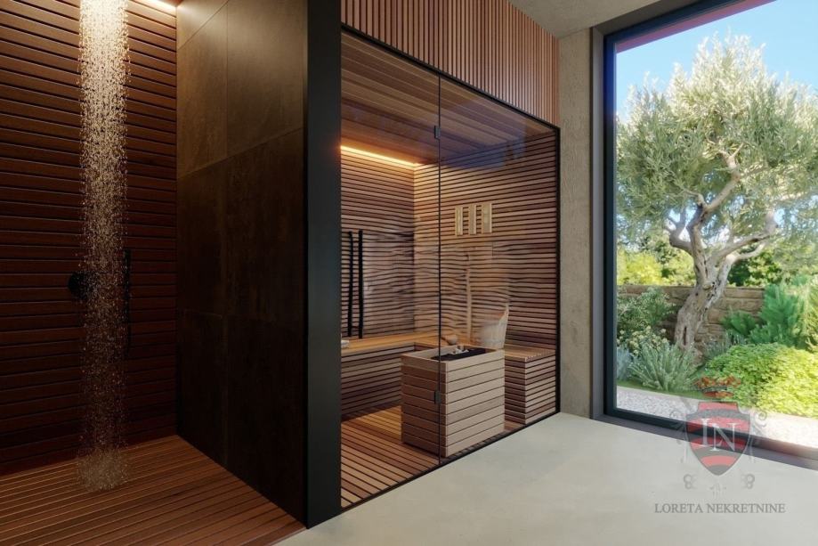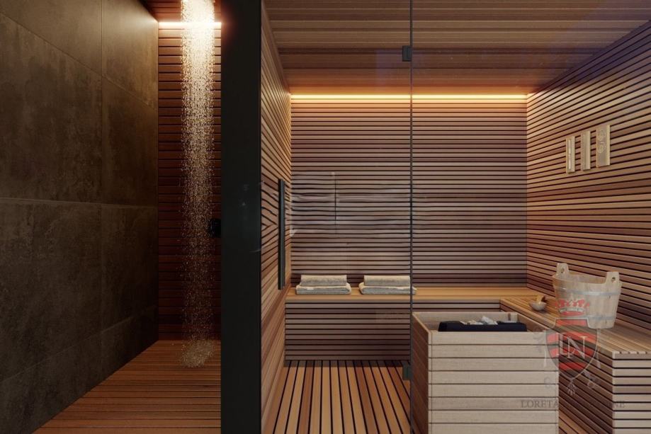 Posebnost vile je SPA prostorija sa saunom, odvojenim wc-om i tuš zonom koja se nalazi u prizemnom dijelu sa pogledom na zelenilo okućnice. Na gornjoj etaži nalaze se dvije prostrane spavaće sobe sa vlastitim kupaonicama.
