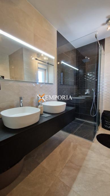 Die Villa besteht aus einem Erdgeschoss und einem ersten Stock sowie einer Dachterrasse. Das Erdgeschoss besteht aus einem Flur, einem Badezimmer, einer Küche mit Esszimmer und einem Wohnzimmer, einem Schlafzimmer, einer teilweise überdachten Terrasse, einem Abstellraum unter der Treppe und einem weiteren Abstellraum. Das Erdgeschoss hat eine Fläche von 90,83 m2. Im ersten Stock finden Sie einen Flur, zwei Schlafzimmer, ein Schlafzimmer mit Bad, ein Badezimmer und eine teilweise überdachte Terrasse. Das Obergeschoss hat eine Fläche von 77,77 m2. Darüber hinaus führt die Innentreppe zur Dachterrasse, wo Vorbereitungen für einen Whirlpool und eine teilweise installierte Sommerküche vorhanden sind. Die Dachterrasse mit dem dazugehörigen Treppenhaus hat eine Fläche von 85,85 m2.