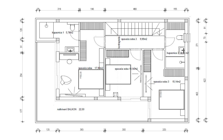U prizemlju su praktično smještene ostava i vešeraj, a stepenice vas vode na kat vile. Na katu se nalaze tri spavaće sobe te dvije kupaonice. Glavna spavaća soba ima i vlastitu kupaonicu. Iz dvije spavaće sobe imate izlaz na natkriveni balkon površine 22 m2.