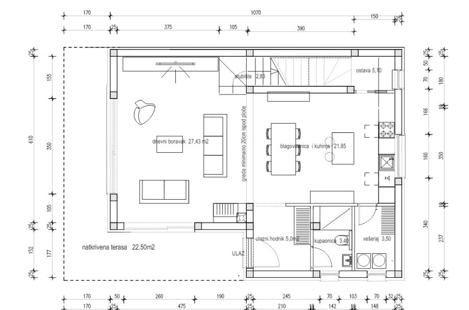 U prizemlju se nalazi open space kuhinja, blagovaonica i dnevni boravak iz kojeg direktno izlazite na natkrivenu terasu površine 22,5 m2.