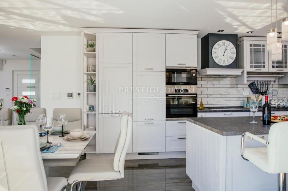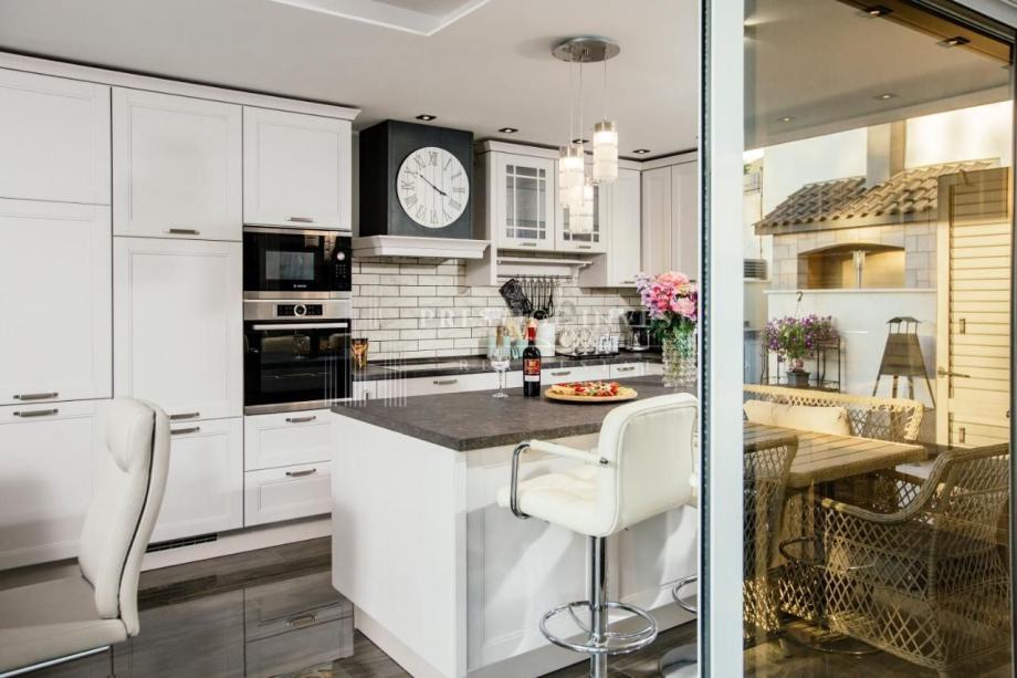 U samom prizemlju ove luksuzne nekretnine smješteni su prostrani dnevni boravak s potpuno opremljenom kuhinjom koje pružaju izlazak na terasu i dvorište s bazenom i ležaljkama koje vam nude oazu za odmor i mir.