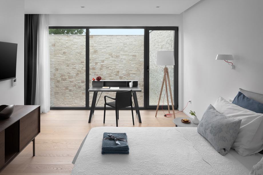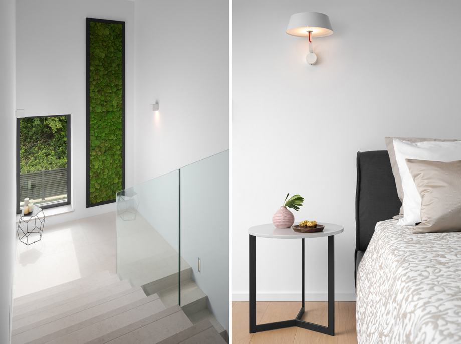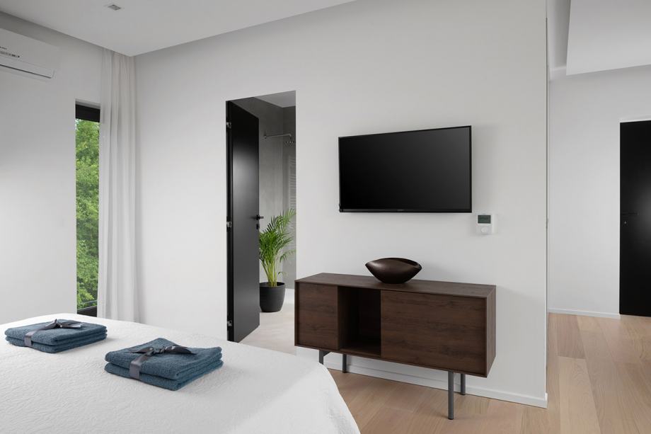 Gornji kat ima 3 spavaće sobe sa vlastitim kupaonicama, sve s obiljem prirodnog svjetla kroz velika panoramska staklena vrata koja povezuju unutarnji prostor s eksterijerom.