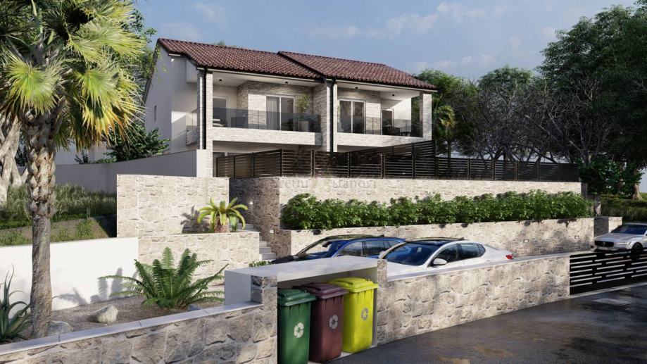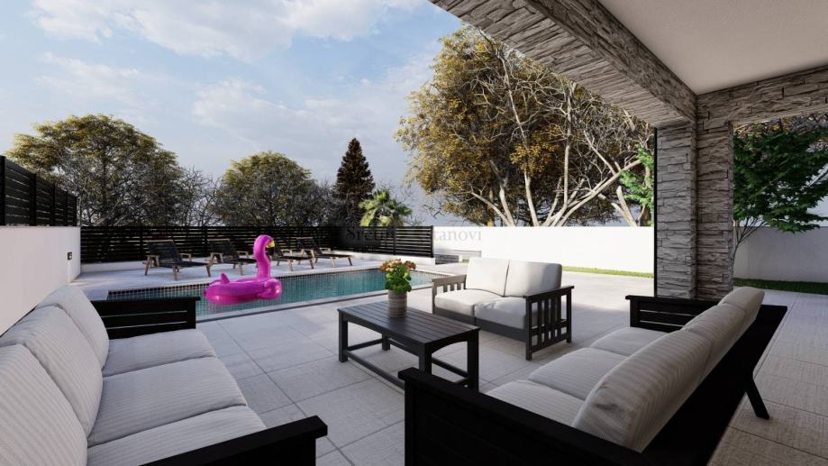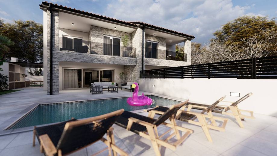 Luxury villa with pool on the island of Krk, in Miholjice - Malinska. New construction that can be moved into by the summer of 2025. Semi-detached house, ground floor and first floor (P+1), floor plan area 199.87 m2. The house with a swimming pool is located on a plot of 510 m2 and has its own 2 parking spaces. The size of the pool is 22m2 (6.4m x 3.4m). On the ground floor of the house there is a living room with a terrace, a corridor, a toilet and a storage room. Upstairs there are 3 bedrooms, each with its own bathroom and terrace. SPC floors, top-quality light ceramics in the bathrooms, beautiful interior doors and excellent joinery. Beautiful, quiet location only 3 kilometers from the first beaches. Clean ownership and proper construction papers.