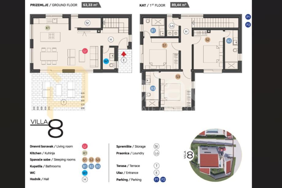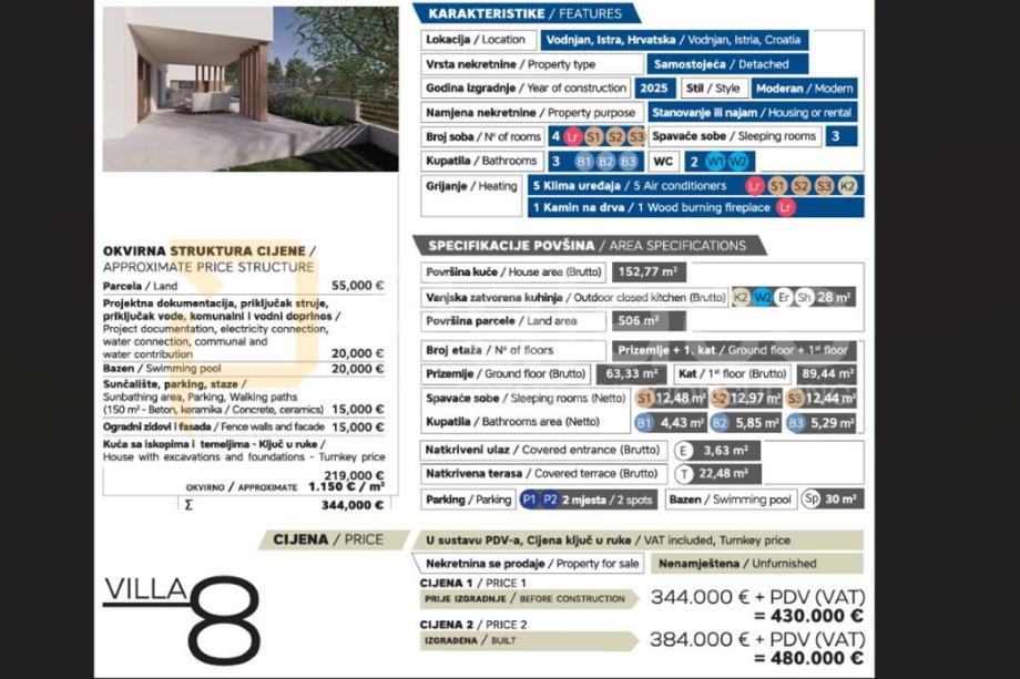 Vila se prostire na dvije funkcionalno uređene etaže. U prizemlju se nalazi otvoreni tip dnevnog boravka sa kuhinjom i blagovaonicom, te gostinjskim toaletom. Na provom katu prostiru se tri moderne spavaće sobe, svaka sa vlastitom kupaonicom što osigurava visoku razinu privatnosti za ukućane i goste.
