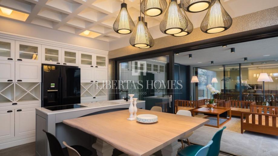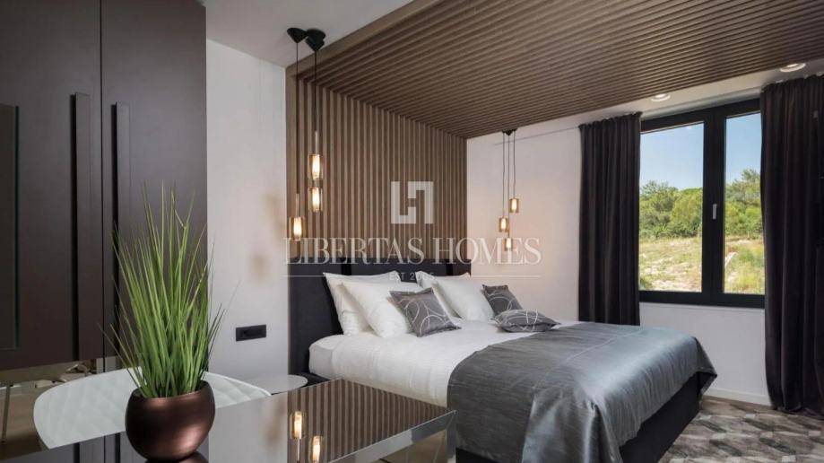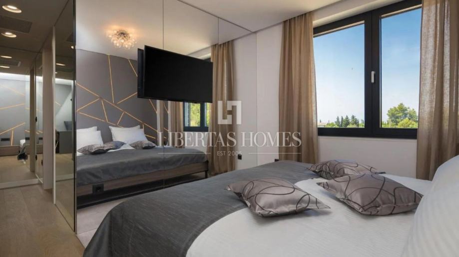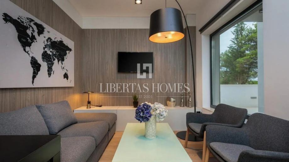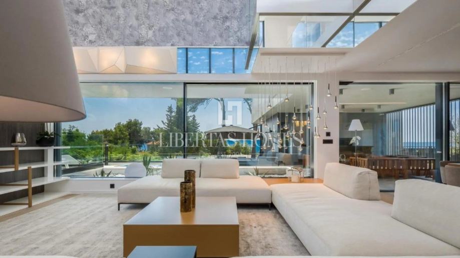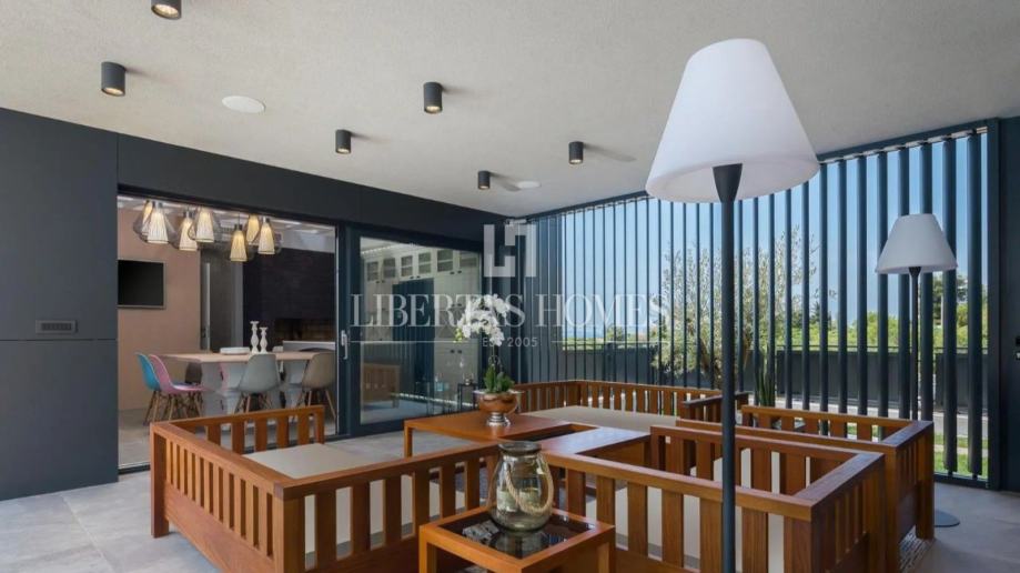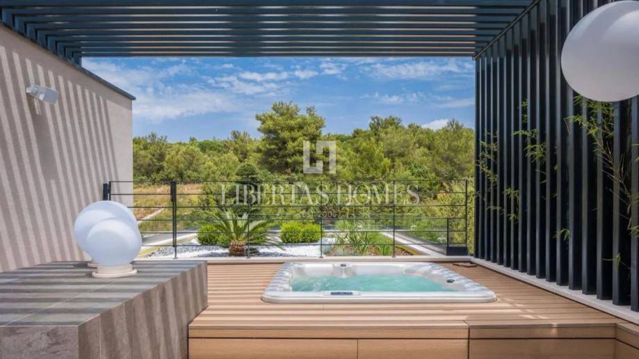 Prozračan i svijetao dnevni prostor osmišljen je u otvorenom konceptu, spajajući dizajnersku kuhinju s elegantnom blagovaonicom i udobnim boravkom, dok tradicionalno uređena taverna nudi savršeno mjesto za druženja i ugodne večeri u krugu obitelji i prijatelja. Osim toga, vila raspolaže radnom sobom, profesionalno opremljenom teretanom te wellness kutkom sa saunom i jacuzzijem, pružajući potpuni komfor i relaksaciju.