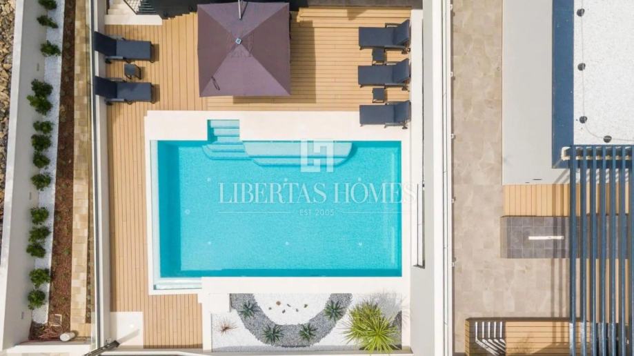 U prostranom i pažljivo uređenom dvorištu smjestio se predivan bazen površine 48 četvornih metara, opremljen sustavom za regulaciju temperature, a okružen udobnim ležaljkama koje pružaju savršeno mjesto za odmor i uživanje. Ova ekskluzivna vila, zaštićena zidovima, jamči potpunu diskreciju te omogućuje bezbrižno opuštanje u ambijentu inspiriranom mediteranskim stilom, uz vrhunsku udobnost i eleganciju.