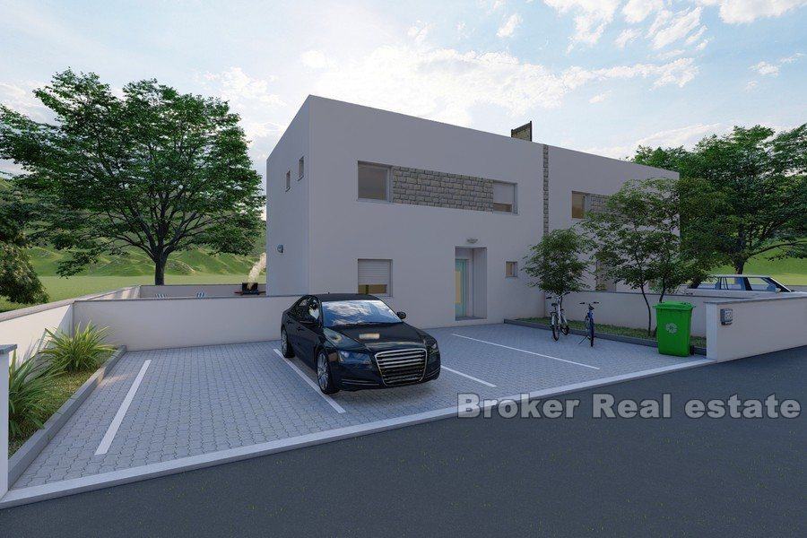 U prizemlju se nalazi kuhinja s blagovaonicom, dnevni boravak, kupaonica, spremište i jedna spavaća sobe, dok se na prvom katu nalaze dvije spavaće sobe sa vlastitom kupaonicom i ostava veličine 8m2, sa svim potrebnim priključcima za perilicu i sušilicu rublja.
