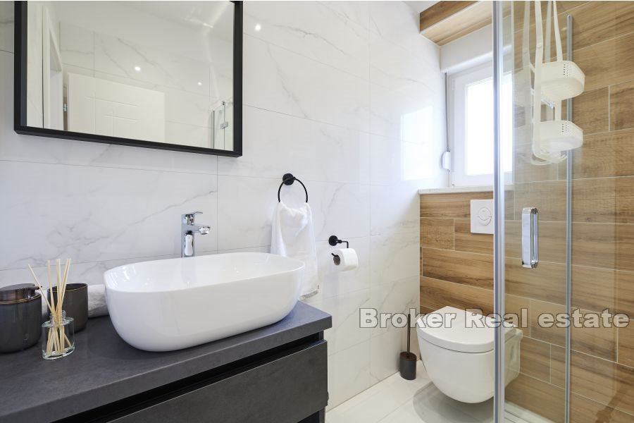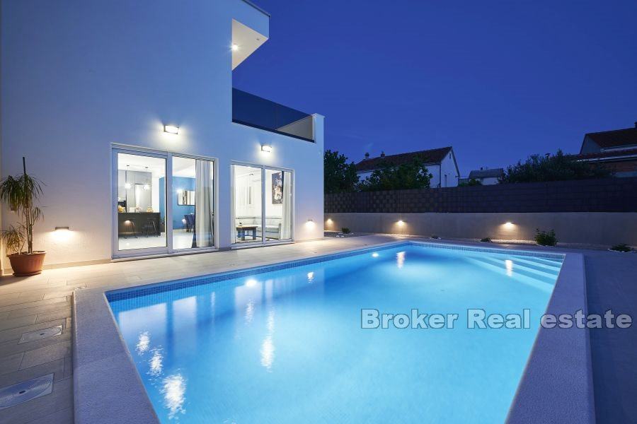 Odmah po izlazu nalazi terasa s bazenom i ljetnom kuhinjom. U prizemlju se također nalazi jedno kupatilo i jedna spavaća soba. Na prvome katu se nalaze tri spavaće sobe i dva i dva kupatila. Dvije spavaće sobe imaju izlaz na zajedničku terasu. Po ulazu u dvorište nalazi se garaža s jednim parkirnim mjestom, dva vanjska parkirna mjesta, te ljetna kuhinja opremljena svim modernim sadržajima.