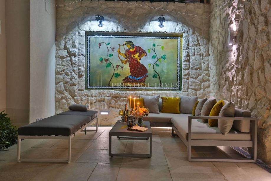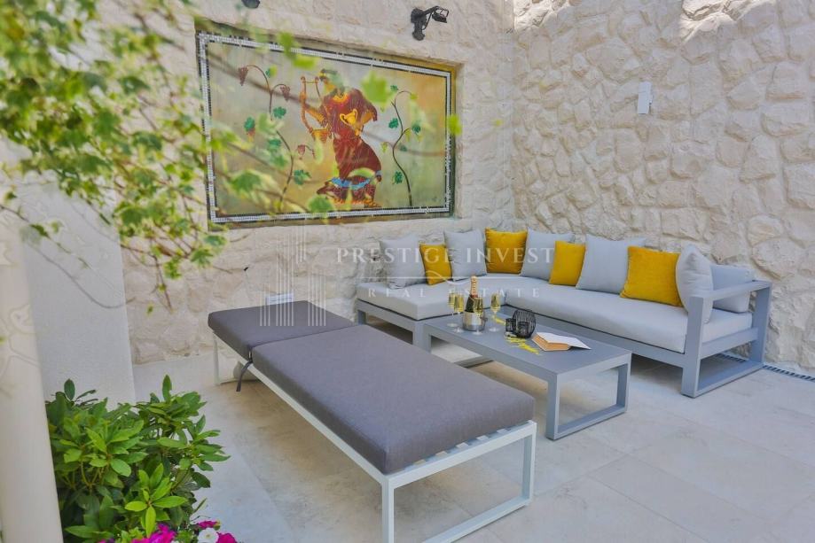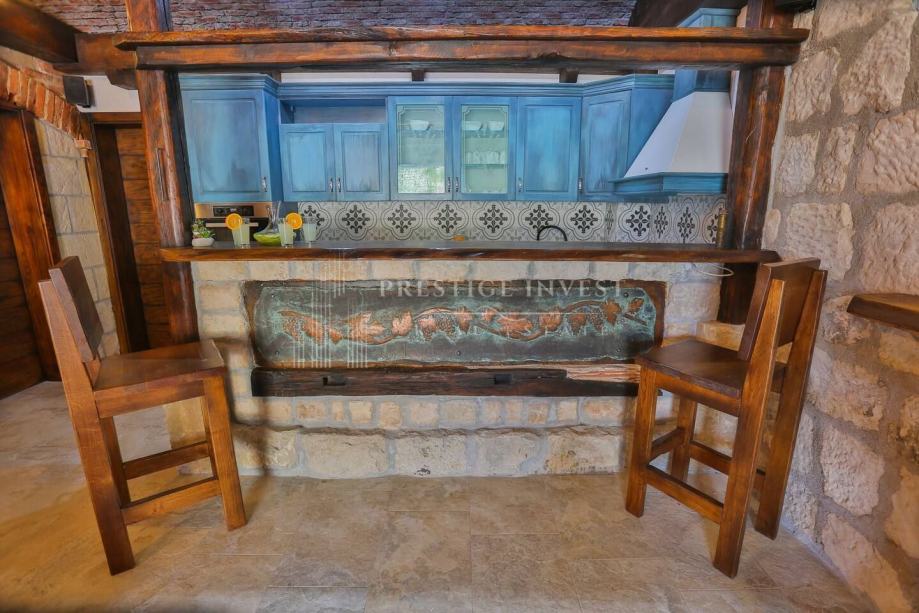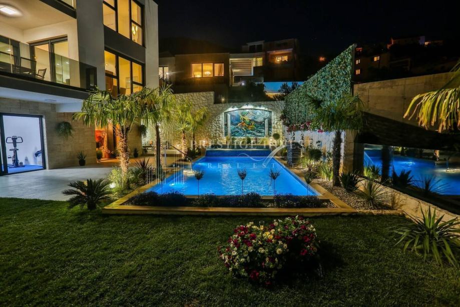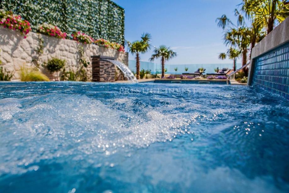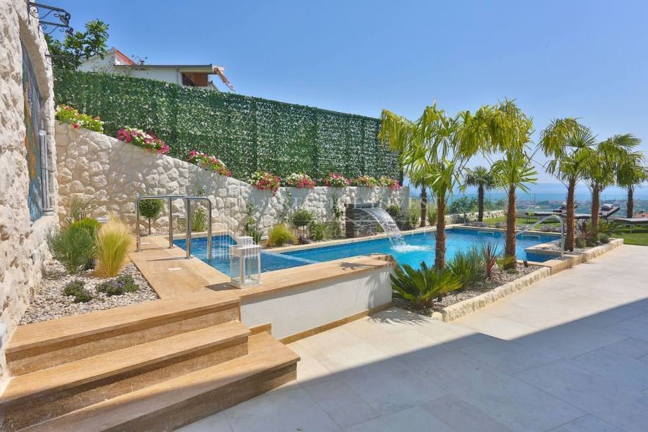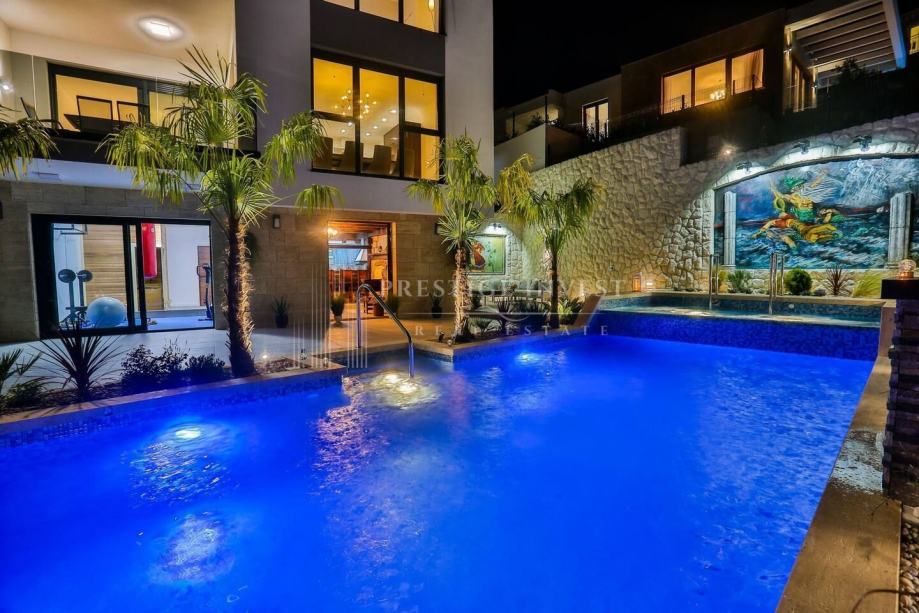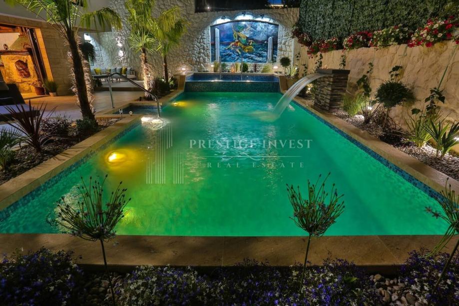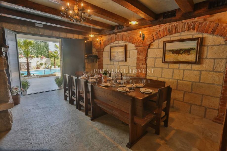 U prizemlju vile od 100 m2 se nalazi tradicionalna konoba uz saunu i teretanu te dodatna soba za multimediju i zabavu koje vode na prostranu terasu s bazenom(40m2) i vrtom s mediteranskim biljem i palmama te vanjskim roštiljem.