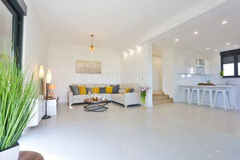 Na prvom katu je smješten dnevni prostor s velikom kuhinjom i blagovaonicom s izlazom na terasu s prekrasnim pogledom na more.