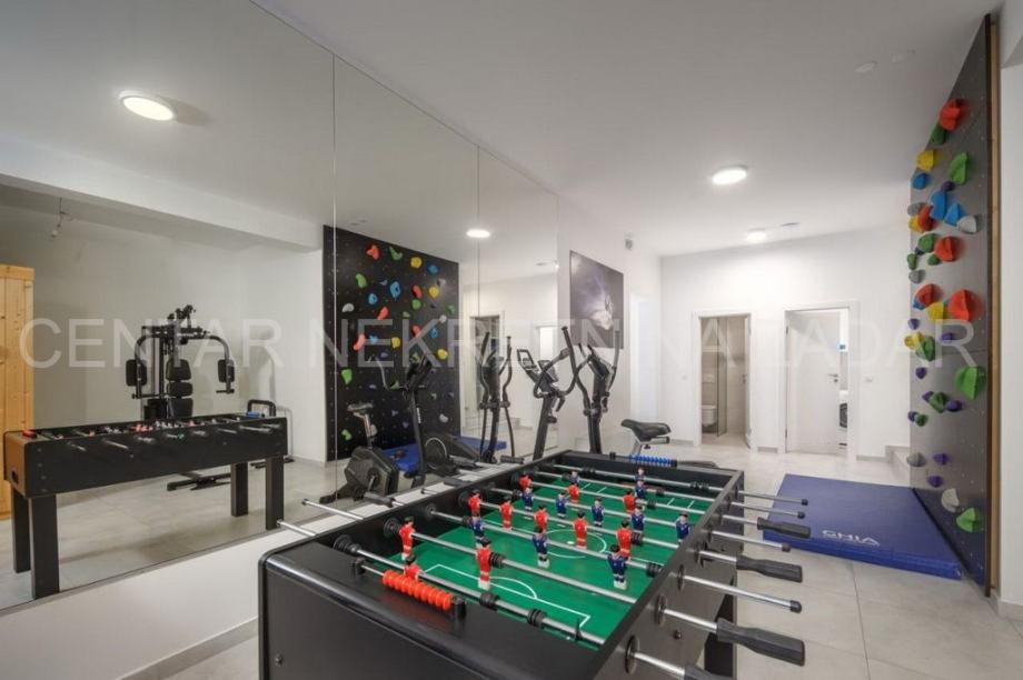 U prizemlju su prostor za druženje i rekreaciju (umjetna stijena za penjanje, biljar, stolni tenis, stolni nogomet), teretana sa saunom i kupaonicom te praona. Izlaz je na terasu s ležaljkama koje okružuju bazen od 45 m².