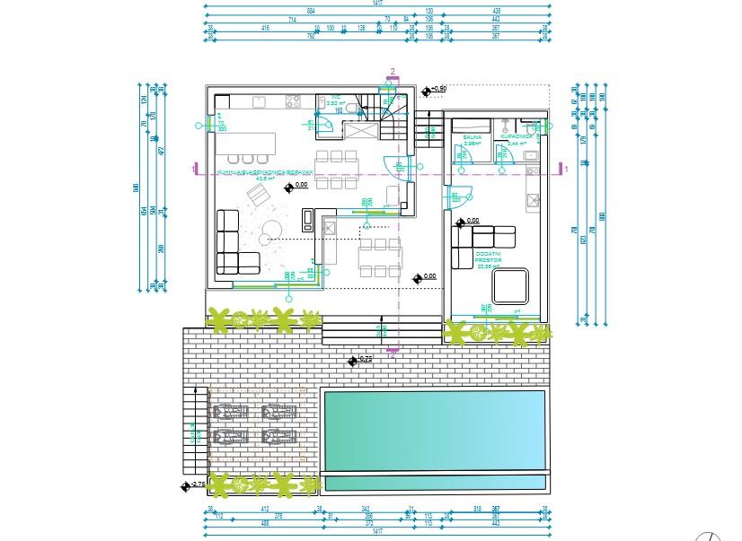 It covers 195.4 m² of gross area, or 154.08 m² of usable area, distributed over two floors. In front of the house there is a 32 m² “infinity” pool with a sunbathing area and an outdoor dining area with a barbecue - a total of 72 m² of intimate outdoor space for enjoying the outdoors.