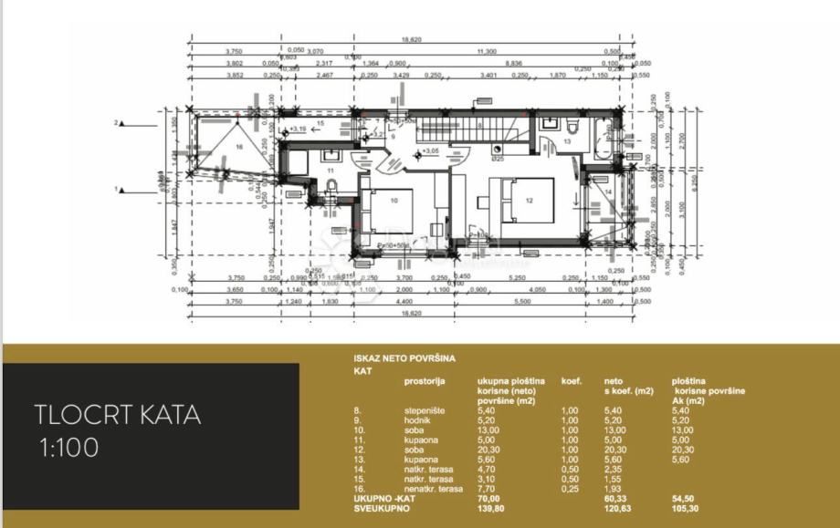 Na prvom katu smjestio se hodnik, dvije prostrane spavaće sobe, svaka s vlastitom kupaonicom i terasama.