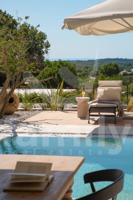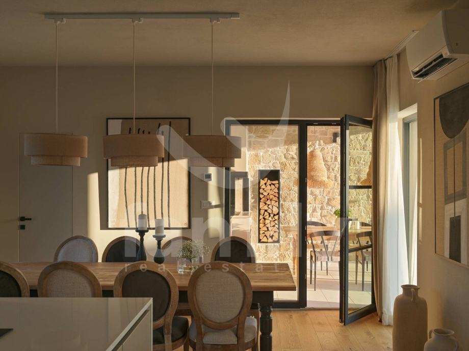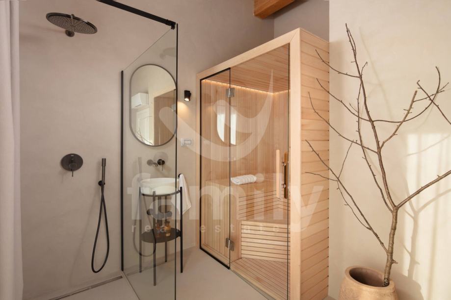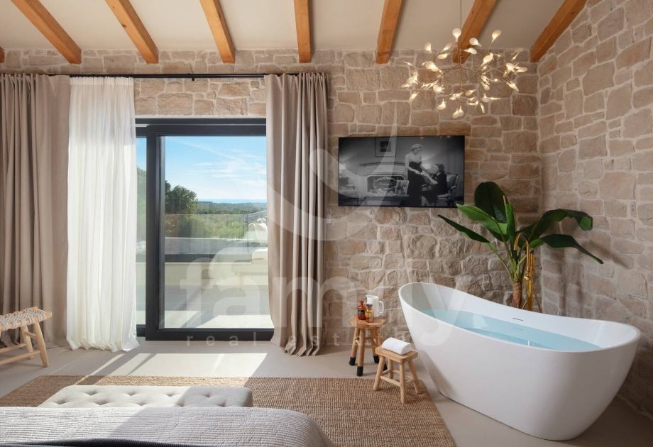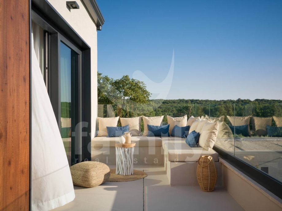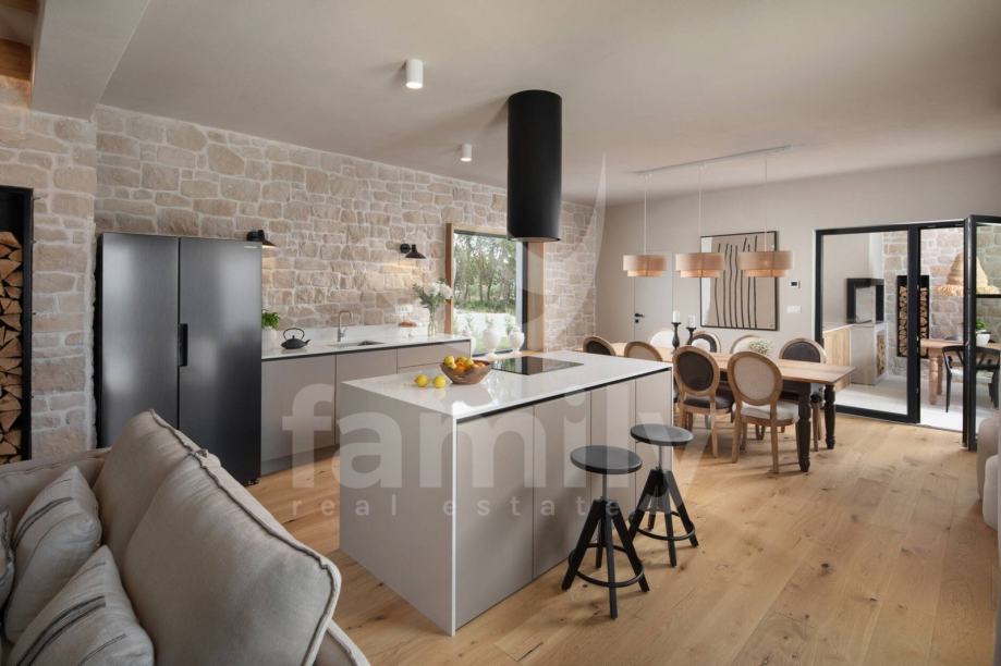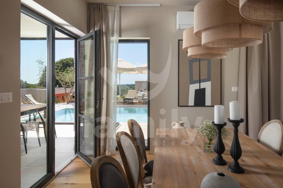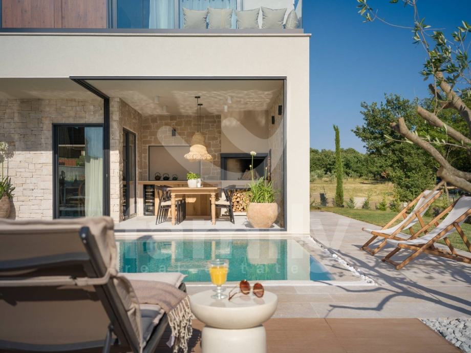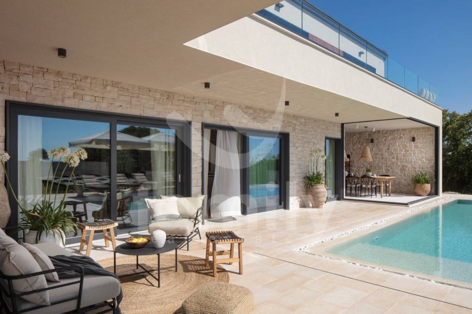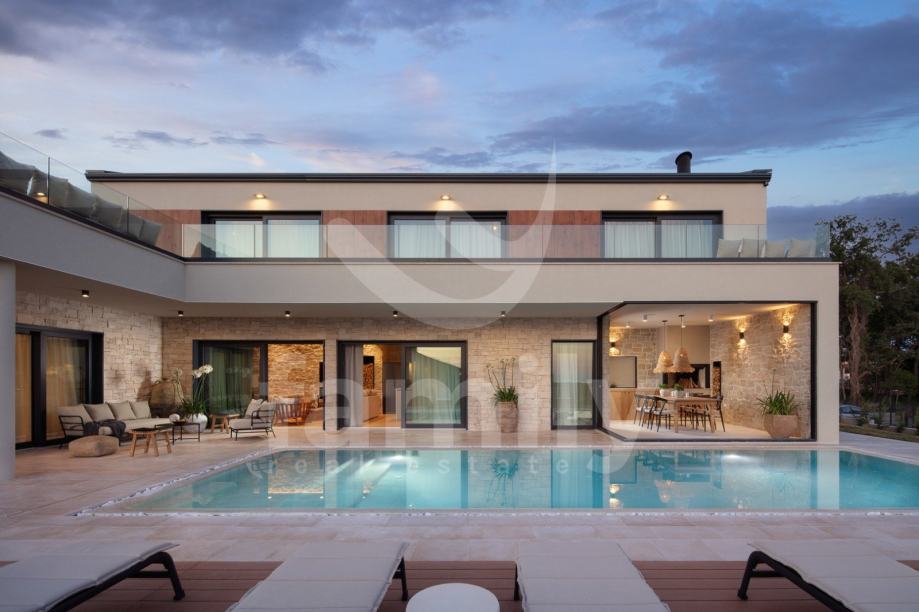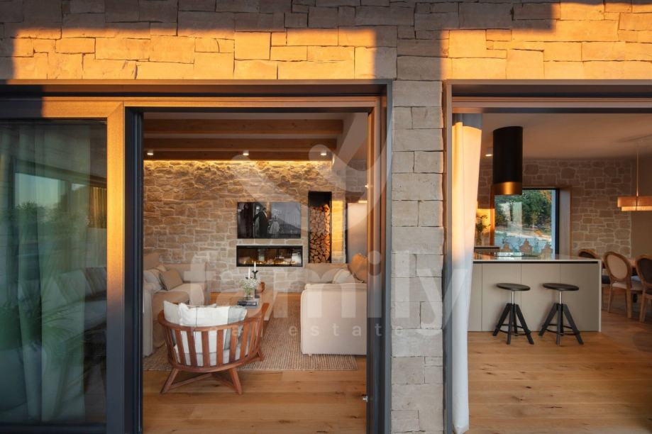 Moderna dizajnerska vila s grijanim bazenom, wellnesom i pogledom na more nalazi na svega 3 km od glavnih atrakcija spomenutog šarmantnog mjesta. Ukupna stambena površina iznosi 270 m2 raspoređenih na prizemlje i kat. Prizemlje se sastoji od prostranog i osvijetljenog dnevnog boravka, kuhinje koja je povezana s blagavaonicom i osmišljeno opremljena modernim namještajem, jednom spavaćom sobom koja je povezana sa kupaonicom, dodatni toalet i funkcijonalna ostava.