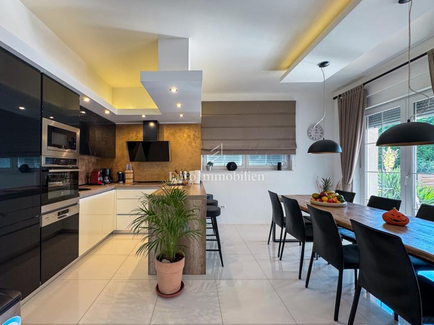 Svijetli dnevni boravak povezan s blagovaonicom i modernom kuhinjom, s izlazom na natkrivenu terasu i očaravajuće dvorište. Idealno mjesto za obiteljsko druženje i opuštanje na otvorenom.