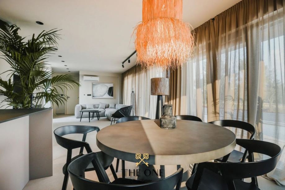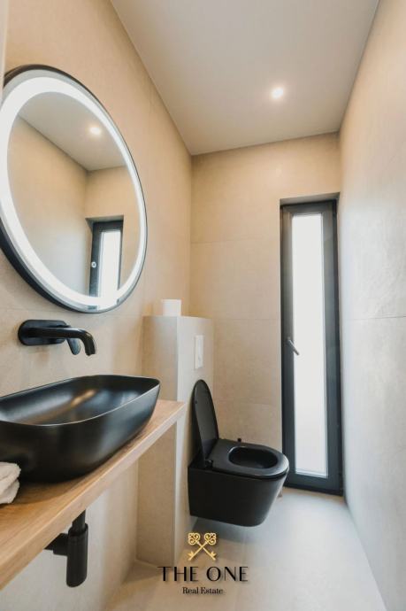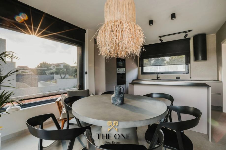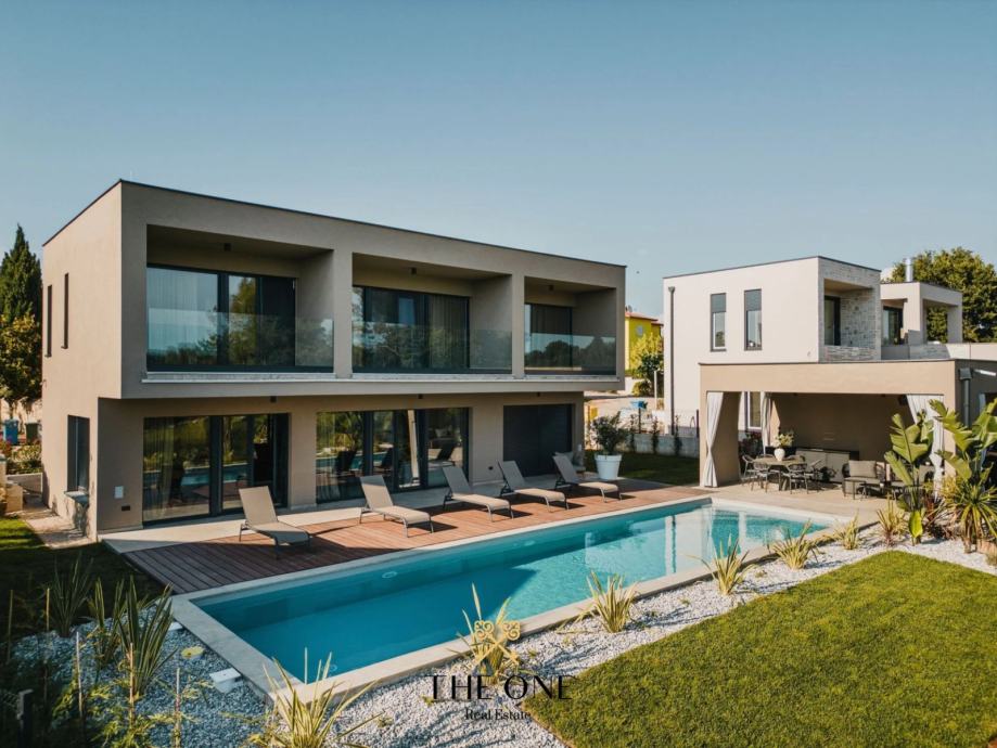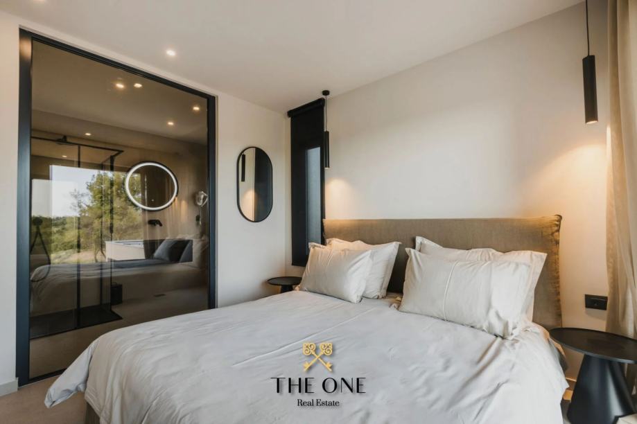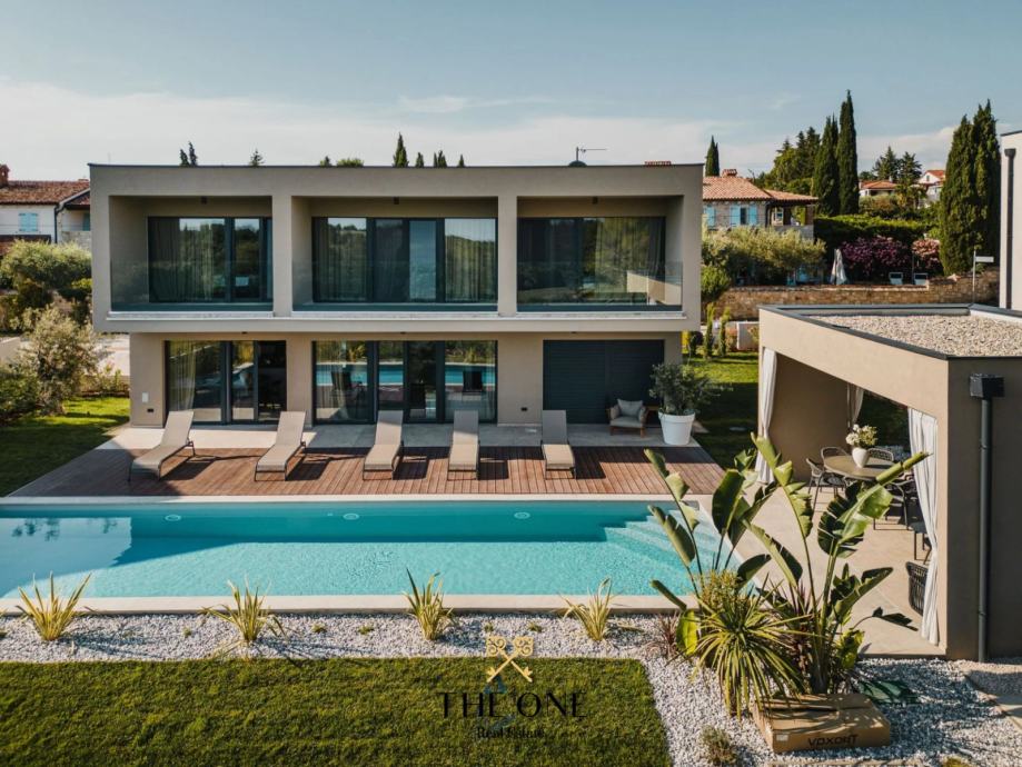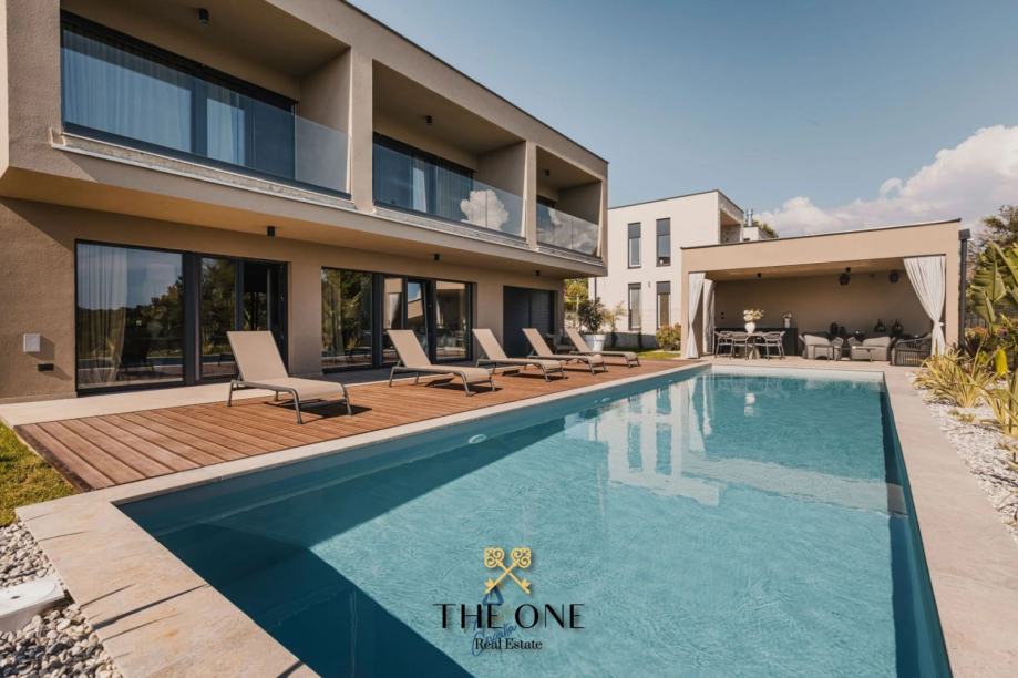 Ova impozantna vila nalazi se na parceli od 601 m2 i proteže se na dvije etaže, prizemlje i prvi kat. U prizemlju vile nalazi se ulazni hodnik koji vodi u otvoreni koncept koji se sastoji od kuhinje s blagovaonicom i prostranog dnevnog boravka s izravnim izlazom na natkrivenu terasu s prekrasnim pogledom. Na terasi se nalazi ljetna kuhinja, dnevni boravak i jacuzzi. Odmah ispod nalazi se bazen okružen prostranim sunčalištem. Na istom katu je smještena jedna spavaća soba i zasebni toalet.