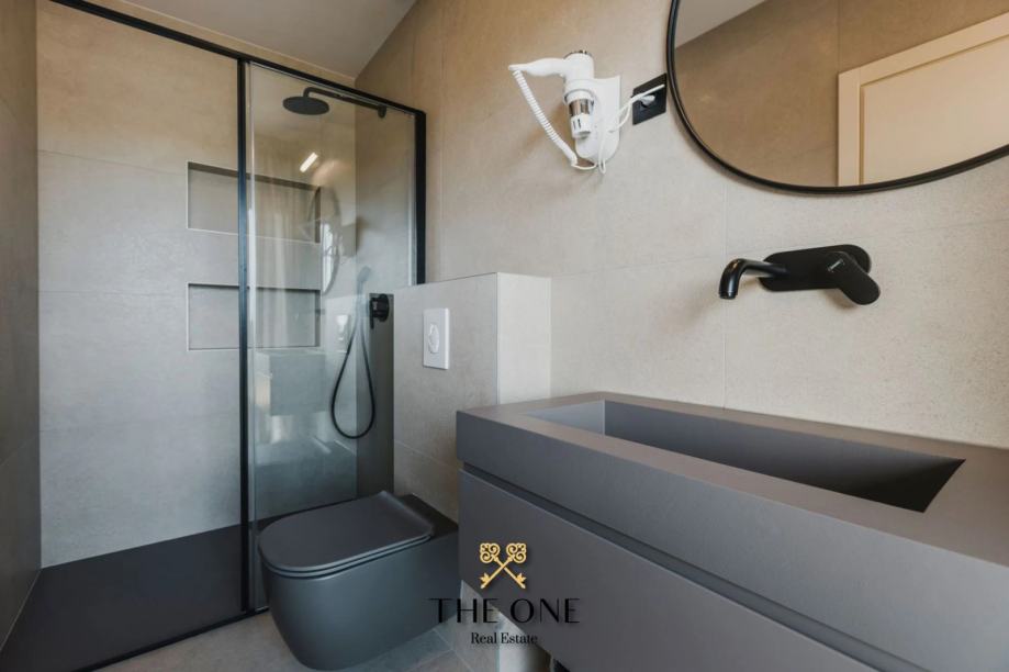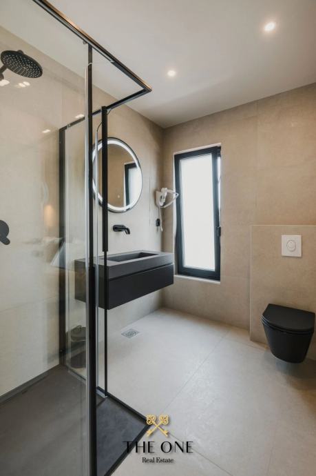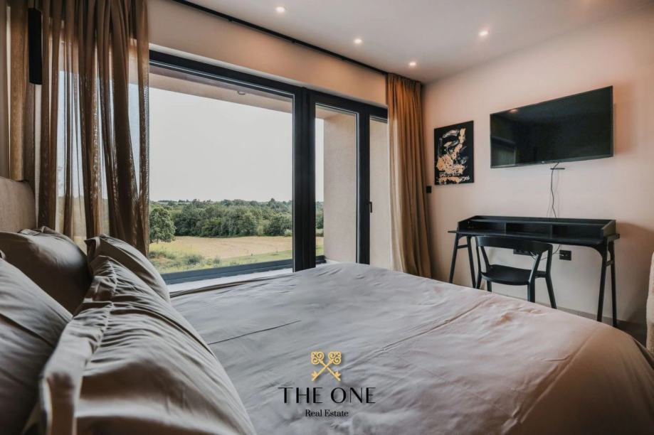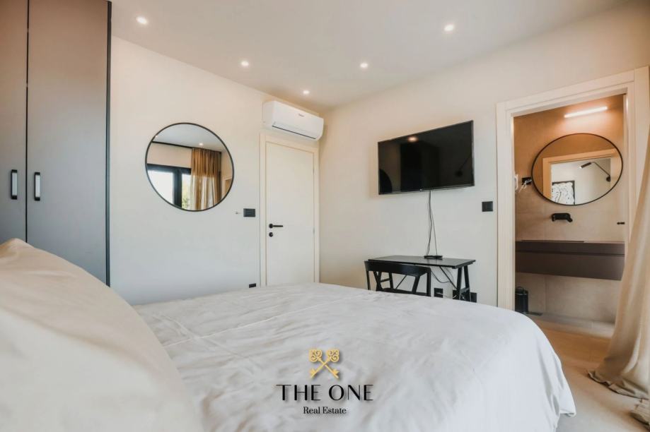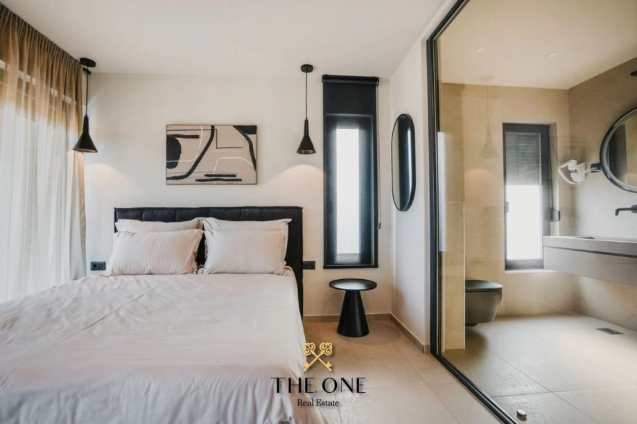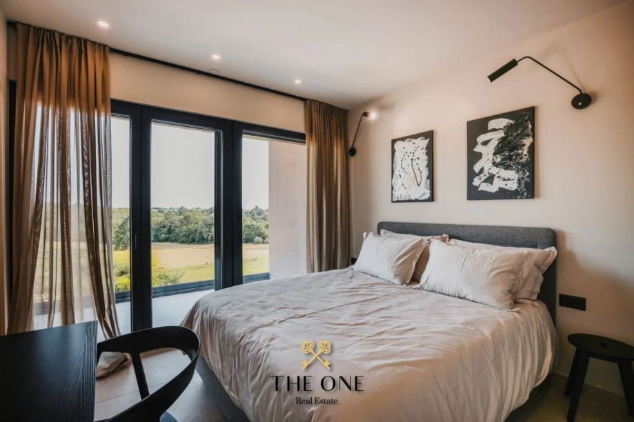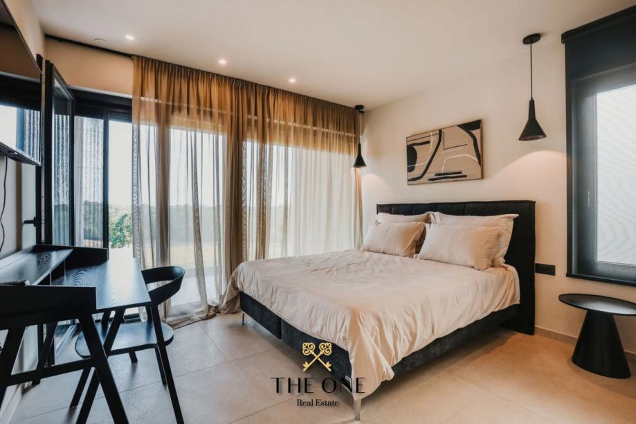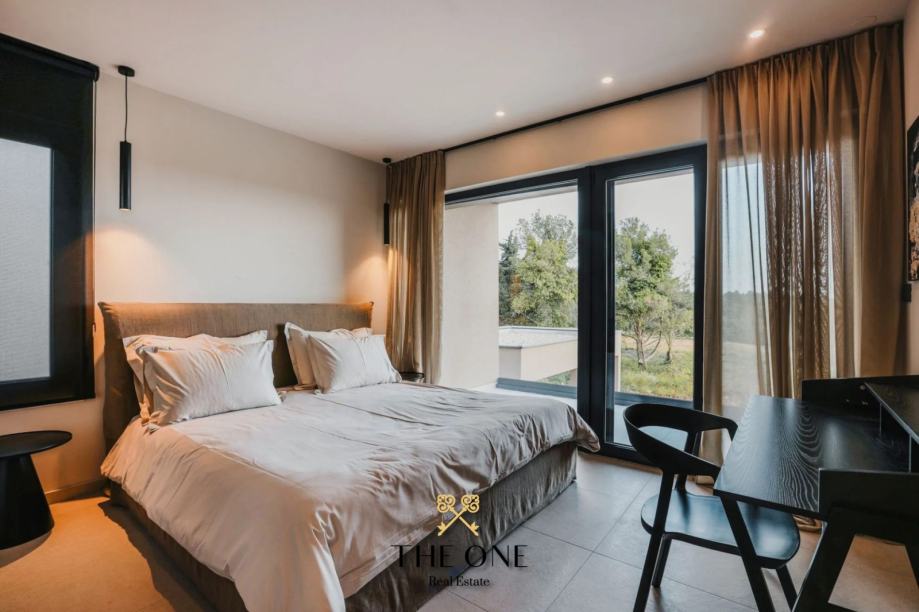 Na1. katu nalaze se tri prostrane spavaće sobe, svaka sa svojom kupaonicom i izlazom na terasu. S terase se pruža prekrasan pogled na prirodu, šumu i djelomičan pogled na more. Vila je u potpunosti opremljena stilskim namještajem rađenim po mjeri, a posebna pažnja posvećena je svakom detalju u uređenju interijera. Osim toga, vila je opremljena podnim grijanjem na toplinske pumpe, kaminom i inverter klima uređajima, što osigurava udobnost tijekom cijele godine.
