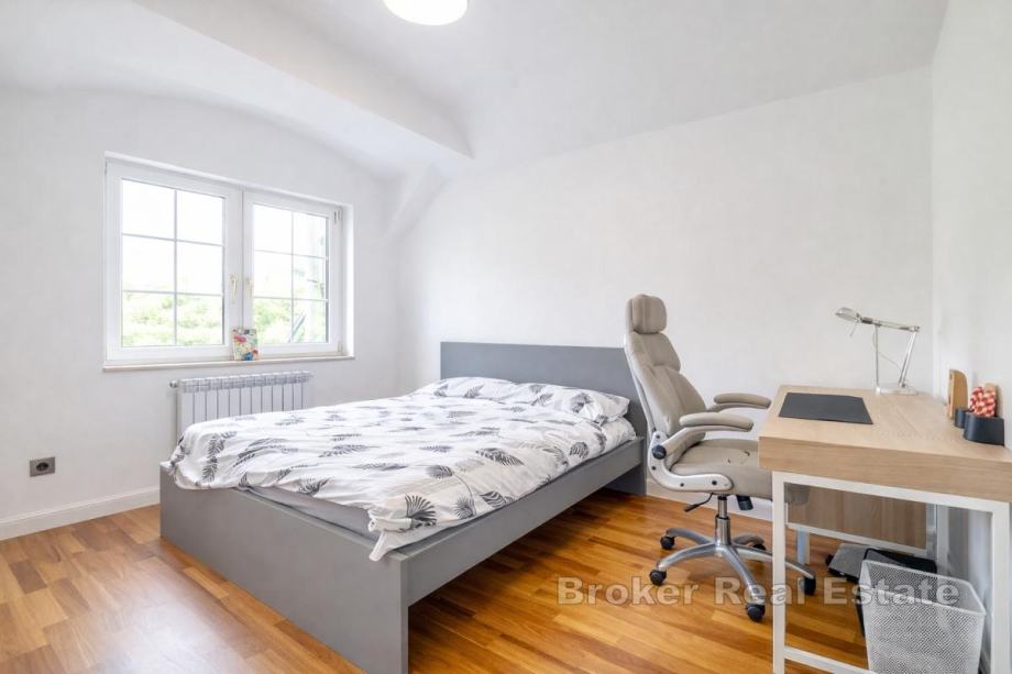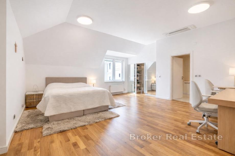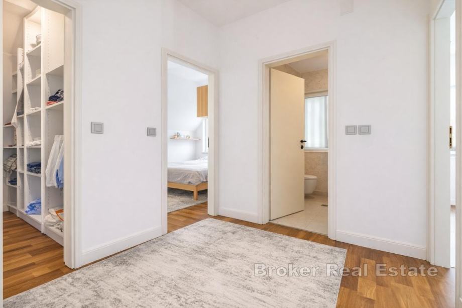 Prvi kat obuhvaća tri spavaće sobe, pri čemu svaka ima vlastitu kupaonicu i garderobu, te izlaz na veliku terasu. Na etaži se dodatno nalazi radni prostor i video portafon.