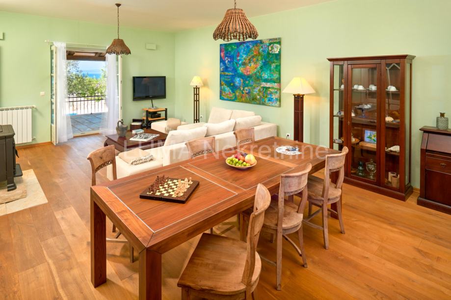 The villa covers 290 m² of living space and is situated on a 4,321 m² plot. It is surrounded by a spacious garden with pine trees and olive groves, and the yard features a large pool (70 m²). A stone wall ensures complete privacy.