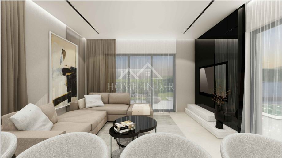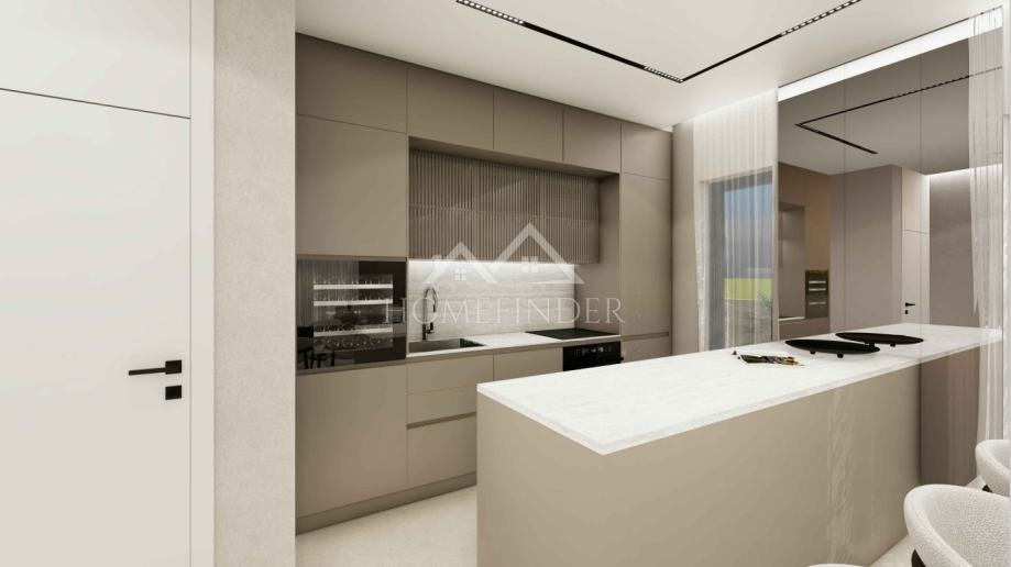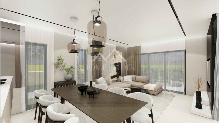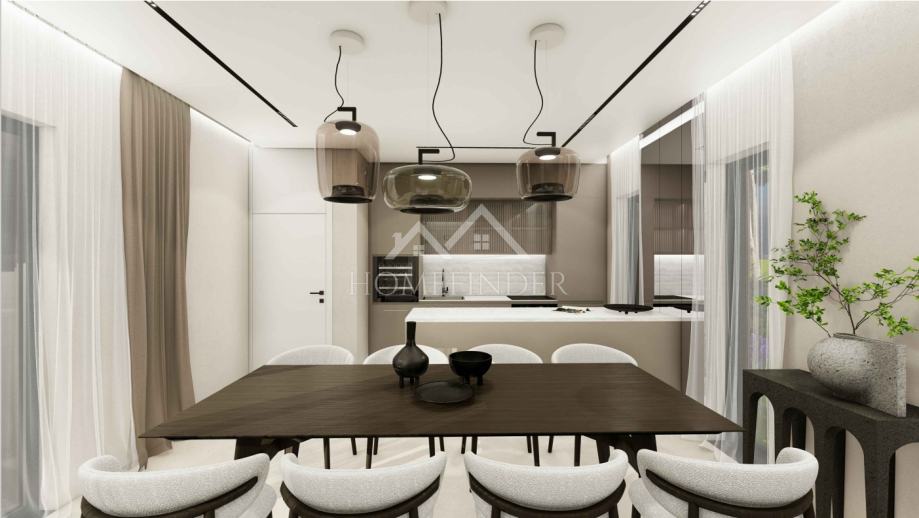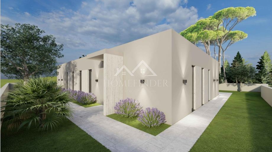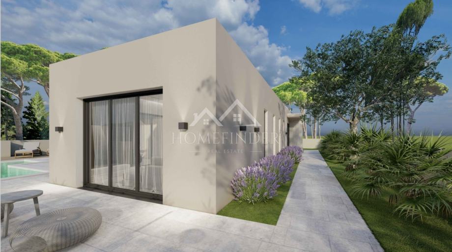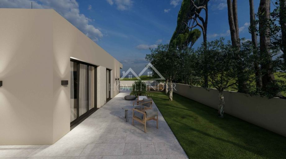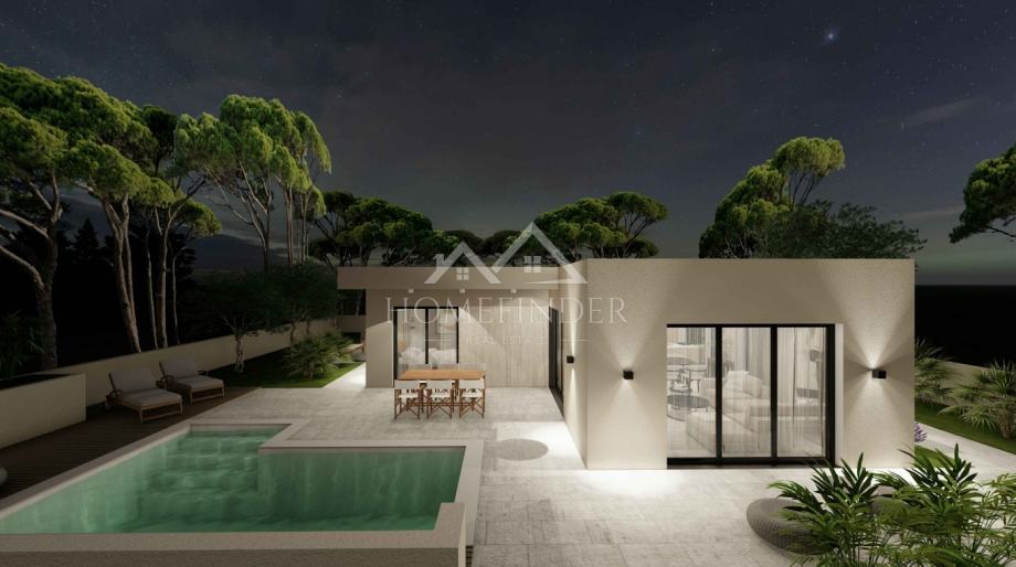 Na parceli od 500 m² smješten je prostran dnevni boravak s kuhinjom i blagovaonicom površine 35 m², otvorenog tlocrta koji se prirodno nastavlja na natkrivenu terasu (10 m²) i grijani bazen (20 m²) sa stepeništem.