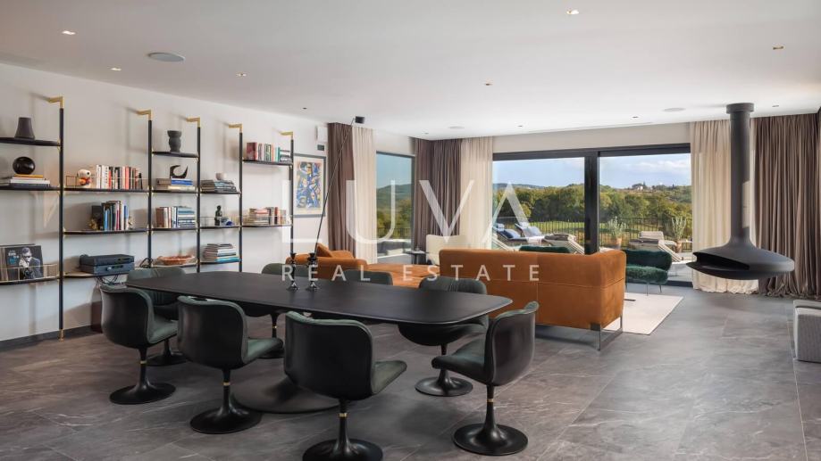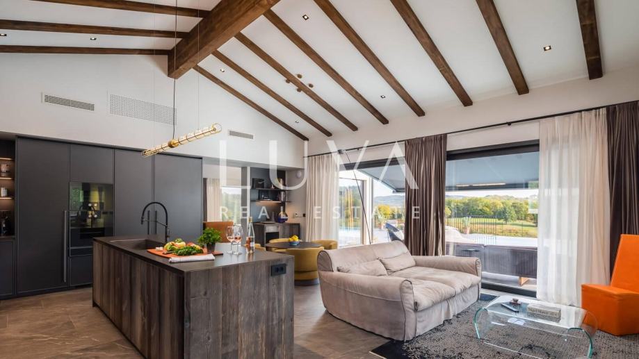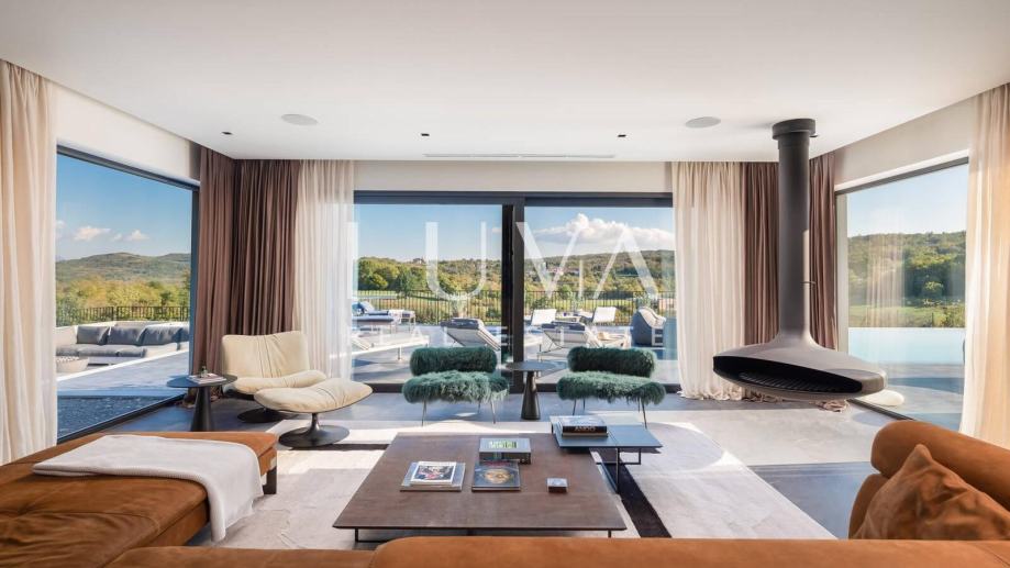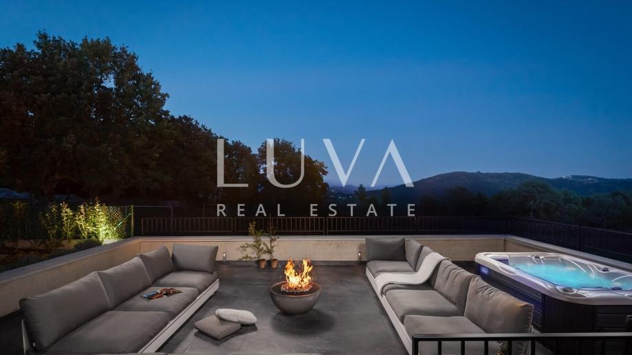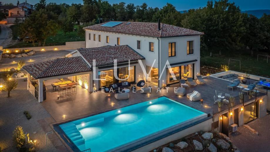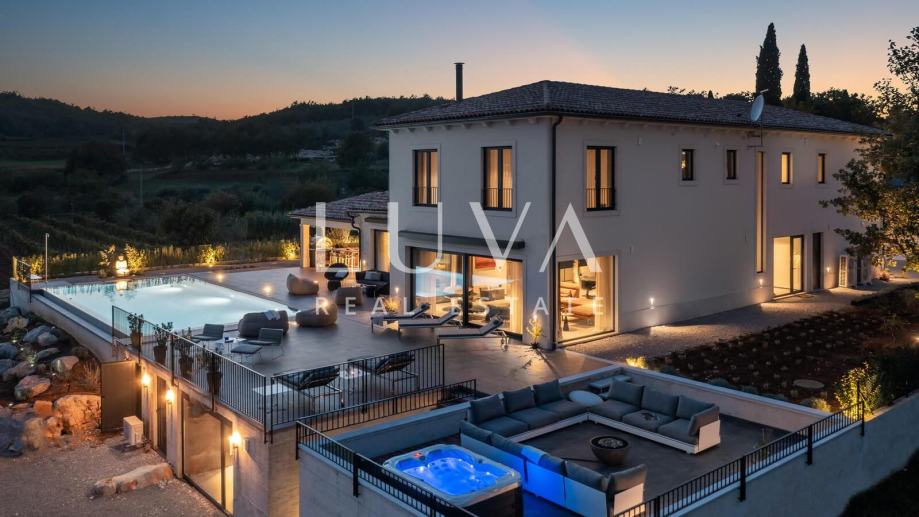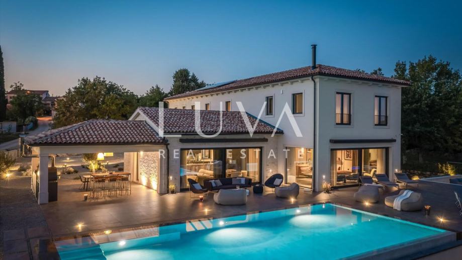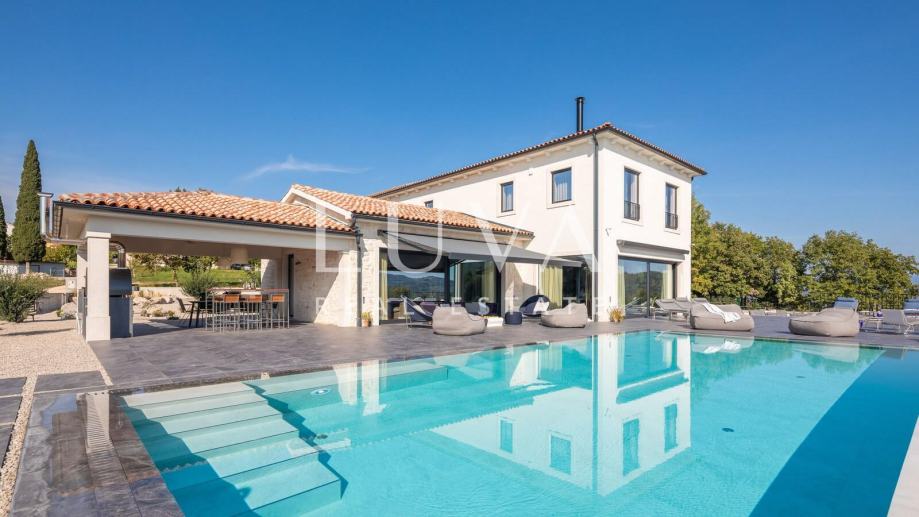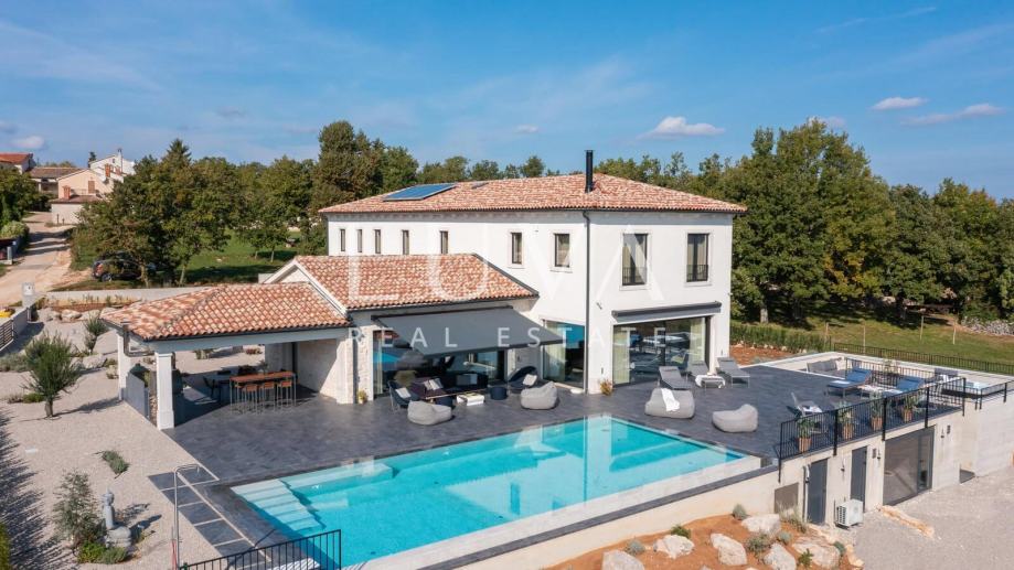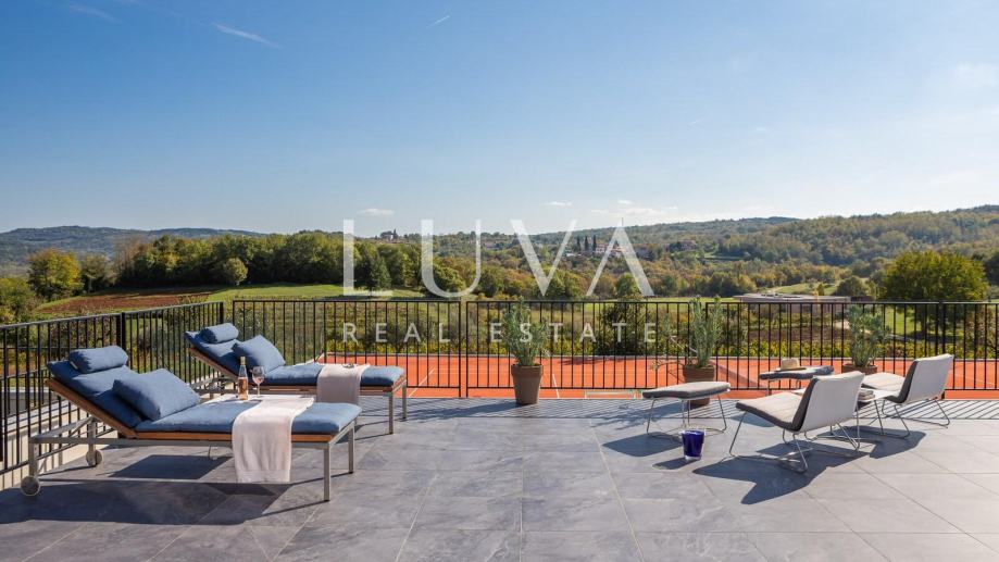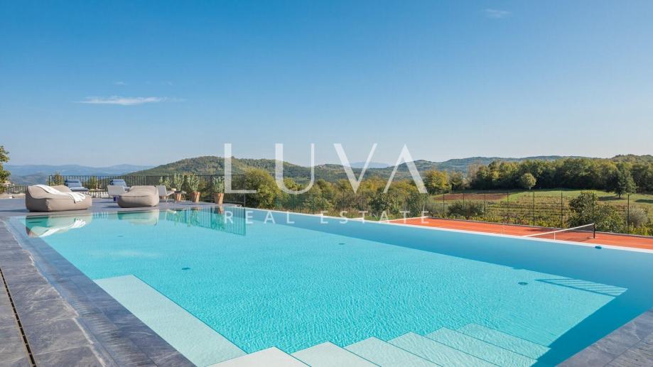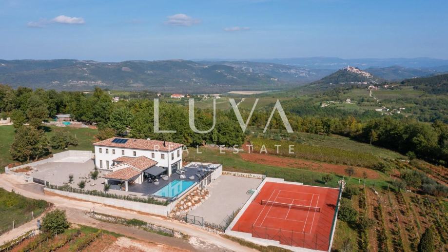 Prodaje se novoizgrađena luksuzna vila s bazenom na malom brežuljku u blizini poznatog grada Motovuna. Ova luksuzna vila je smještena na velikom posjedu od 2000 m2, a zbog povišene pozicije sa zemljišta se pruža predivan pogled na Motovun. Cijeli posjed vile je potpuno ograđen kako bi osigurao privatnost, a ispred vile se nalazi tenis teren.