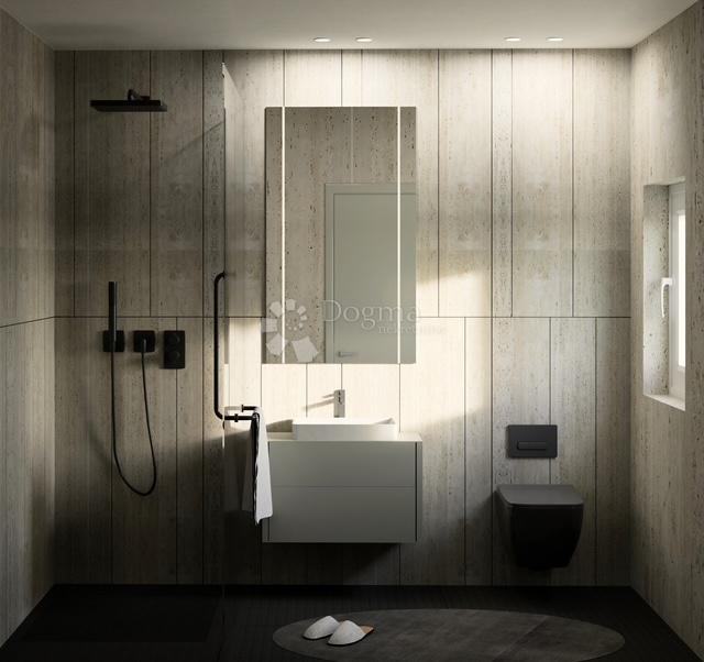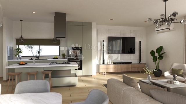 Vila ima ukupnu neto korisnu površinu od 179 m² raspoređenu na dvije etaže. U prizemlju se nalazi dnevni boravak s blagovaonicom i kuhinjom, spavaća soba, kupaonica, WC i ostava, dok natkrivena terasa nudi savršen prostor za opuštanje i druženje. Na katu se nalaze tri spavaće sobe, dvije kupaonice i terasa s pogledom na prirodu. Unutarnje i vanjske stepenice izrađene su od prirodnog kamena, dok uređeni kameni prilaz i zelena površina dodatno naglašavaju luksuz i eleganciju cijelog posjeda.