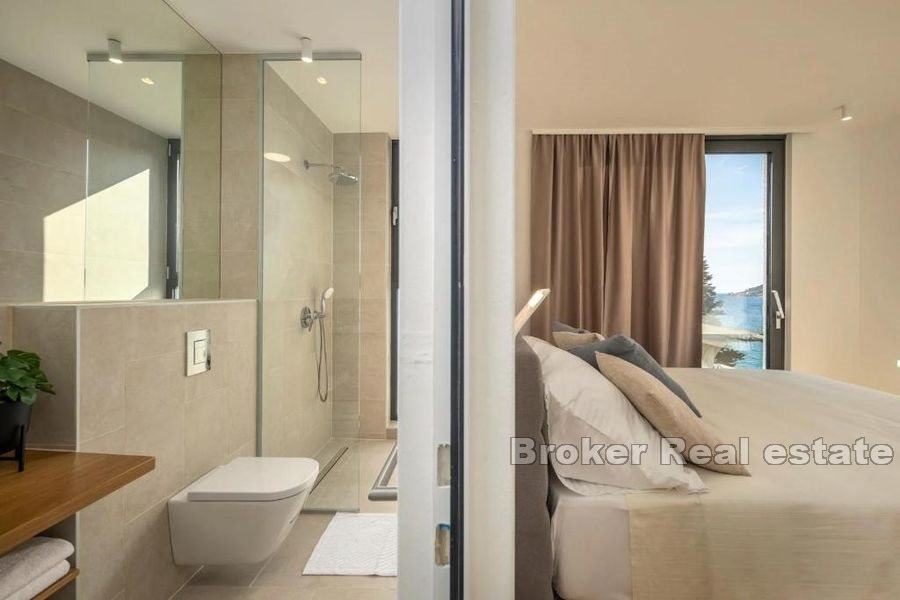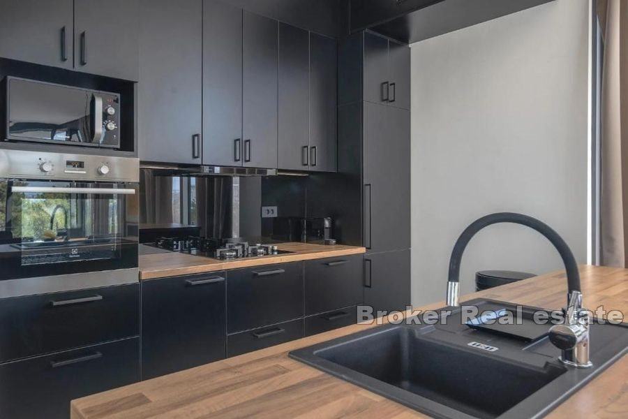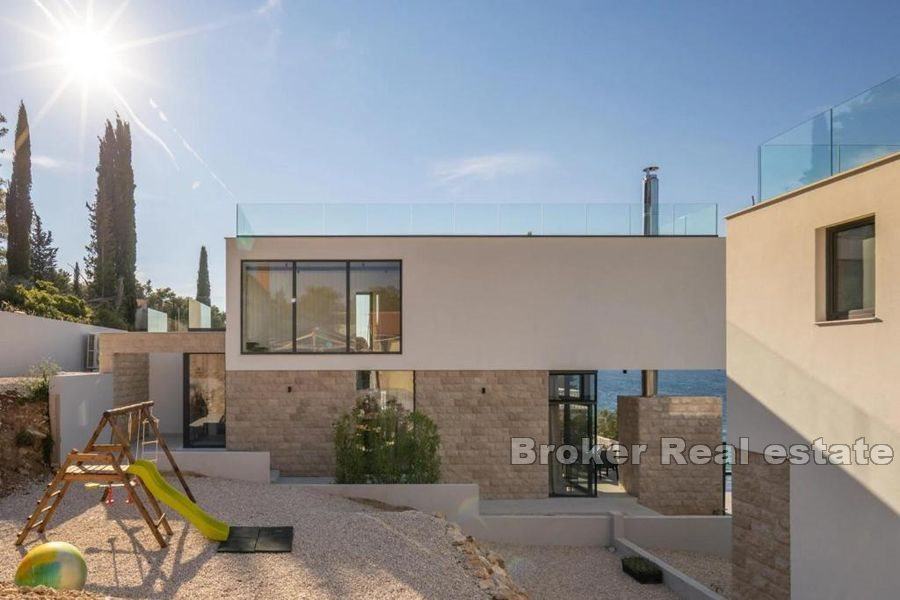 Prizemlje se sastoji od dnevnog boravka s kaminom, kuhinje s blagovaonicom, kupaonice, ostave i garderobe. Na katu se nalaze tri spavaće sobe sa pripadajućim kupaonicama. Prostrana krovna terasa pruža otvoreni pogled na more i mjesto.