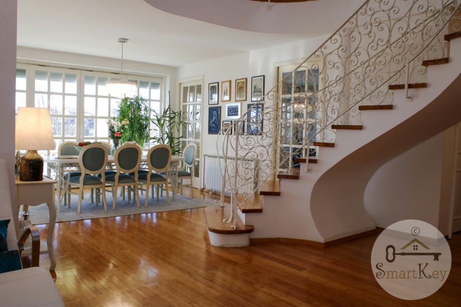 Na kat se dolazi iz dnevnog boravka sa otvorenim stepeništem gdje se nalaze 4 spavaće sobe (dvije imaju pripadajuće kupaonice sa WC-om), galerija, kuhinja i velika kupaonica sa WC-om. Na katu se nalazi izlaz na veliku terasu na zapadnoj strani te spiralne stepenice iz galerije za potkrovlje.