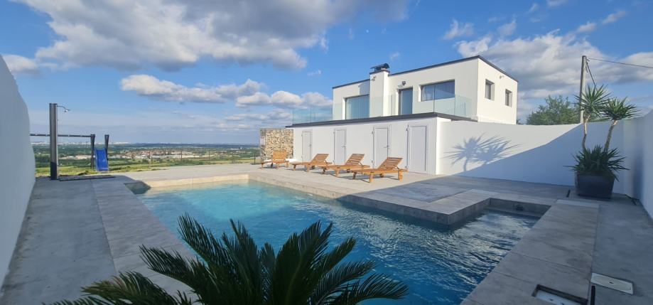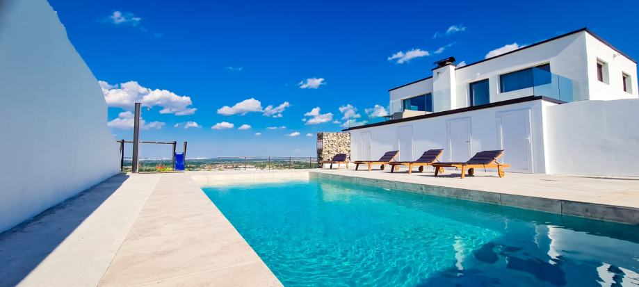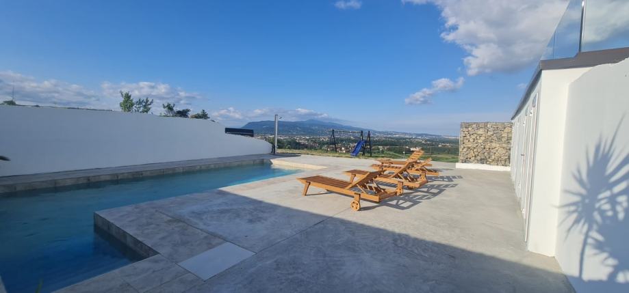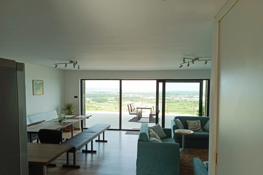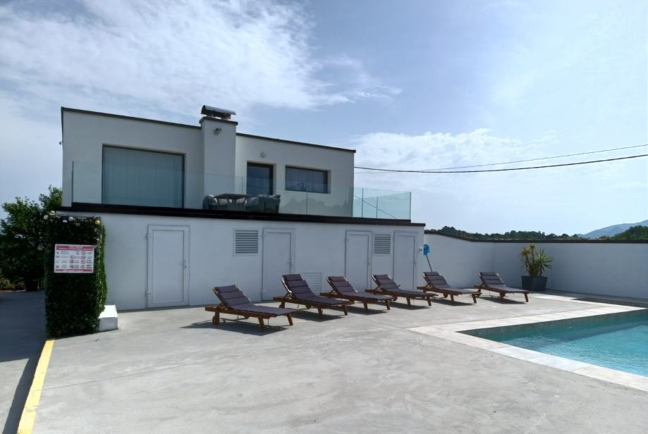 U prizemnom dijelu nalaze se ulazni prostor, kupaonica, radna soba, kuhinja s blagovaonom i dnevnim boravkom iz kojeg se izlazi na terasu (površine ca 200 m2) gdje su smješteni bazen, spremište, pečenjara i garaža.