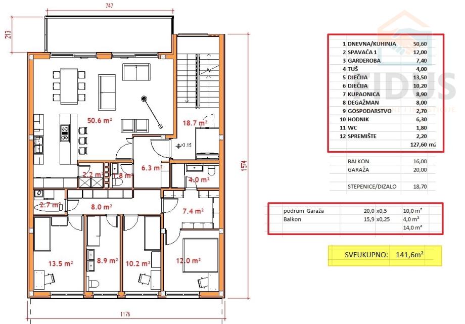Posebnu vrijednost stanu daje balkon površine 15,9 m2, parkirna mjesto u garaži površine 20 m2 te ugrađeno dizalo i parkirna mjesta ispred zgrade.