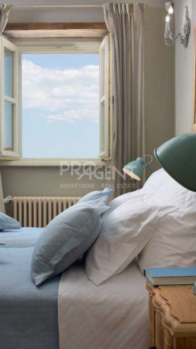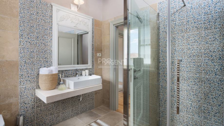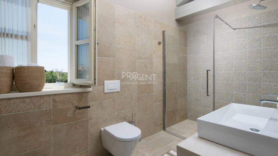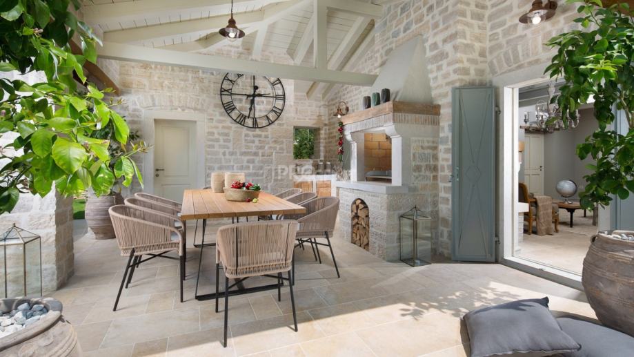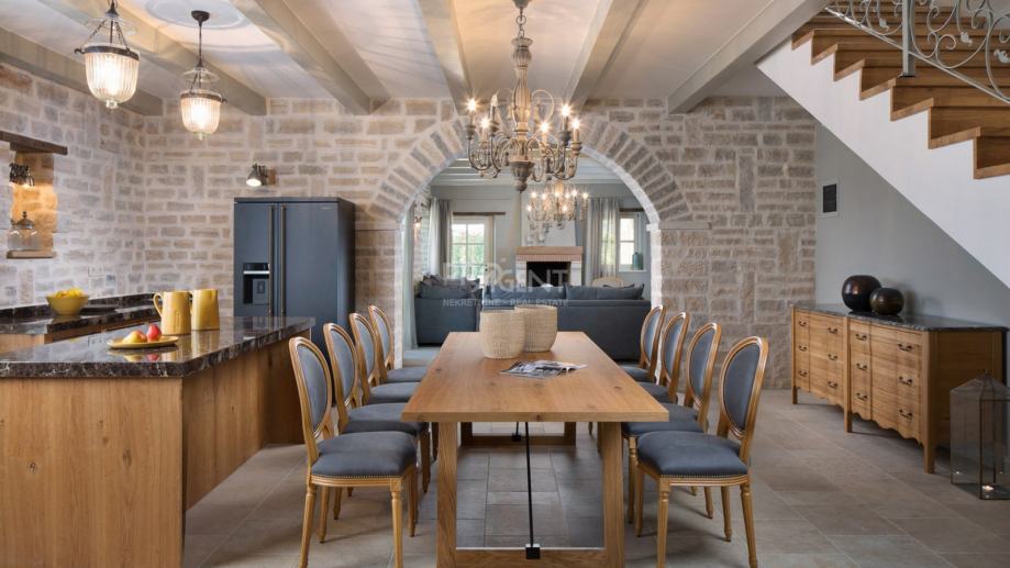 Luksuzna vila površine 353 m2 na dvije potpuno klimatizirane etaže kapaciteta 8 osoba. U prizemlju kuće nalazi se prostrani dnevni boravak sa kaminom i SAT-TV te izlazom na prostranu natkrivenu terasu sa stolom za objedovanje, kaminom za roštiljanje i lounge zonom, velika, potpuno opremljena kuhinja sa blagovaonicom, jedna dvokrevetna soba sa dvostrukim krevetom, vlastitim tuš-WC-om i izlazom na terasu, zaseban WC u dnevnom dijelu i tuš/WC na terasi.