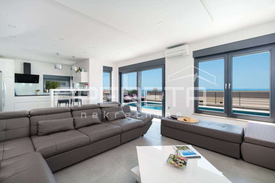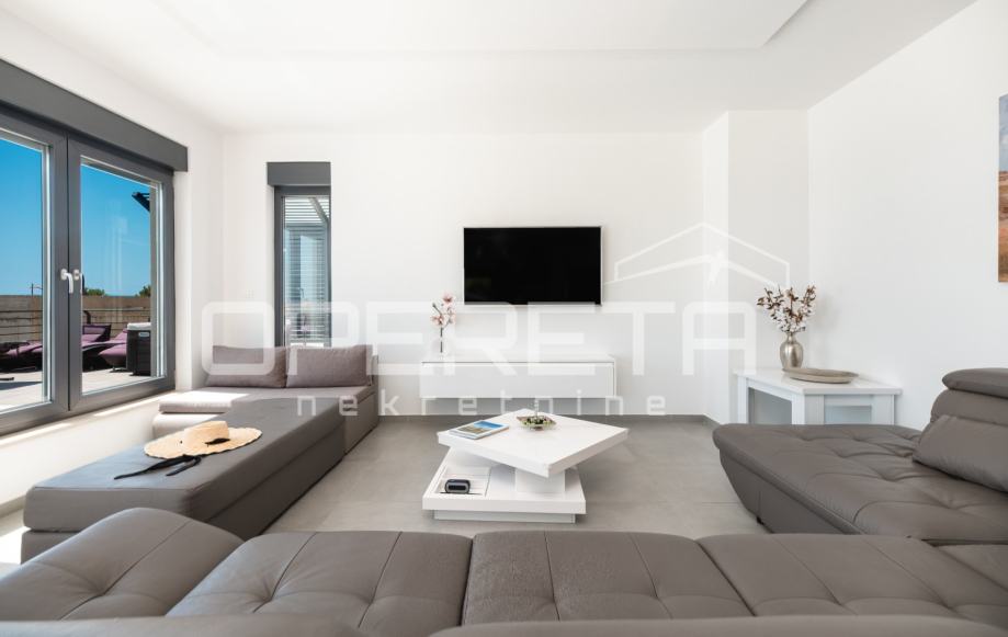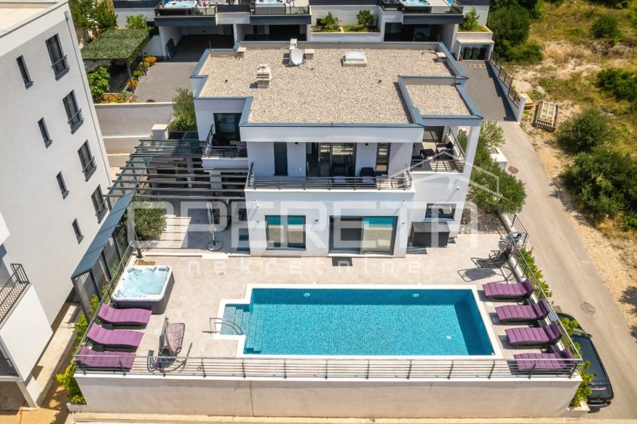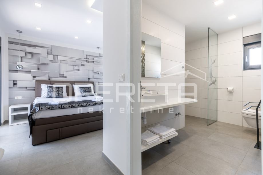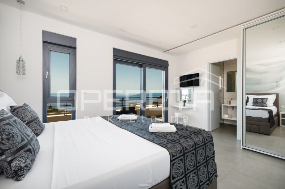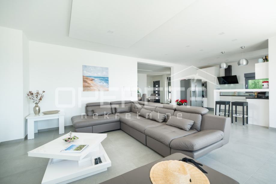Prostrani interijeri uređeni su s posebnom pažnjom prema detaljima, nudeći pet elegantnih spavaćih soba i jednako raskošne kupaonice. Osjećaj privatnosti i ekskluzivnosti prati vas u svakom kutku, od sunčanog vrta do bazena sa sunčalištem koji se skladno uklapa u mediteransko zelenilo.