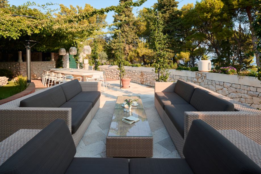 Prostrani vanjski bazen okružen je gustom borovom šumom, lavandom i maslinicima koji se blago spuštaju prema moru, pretvarajući uvalu u idealno mjesto za odmor i opuštanje.