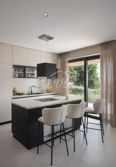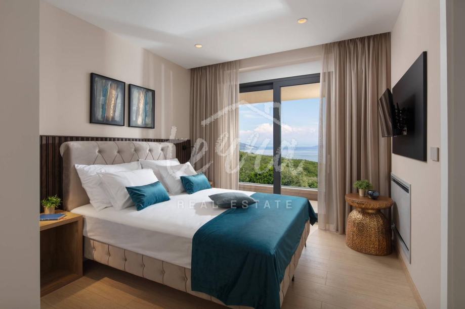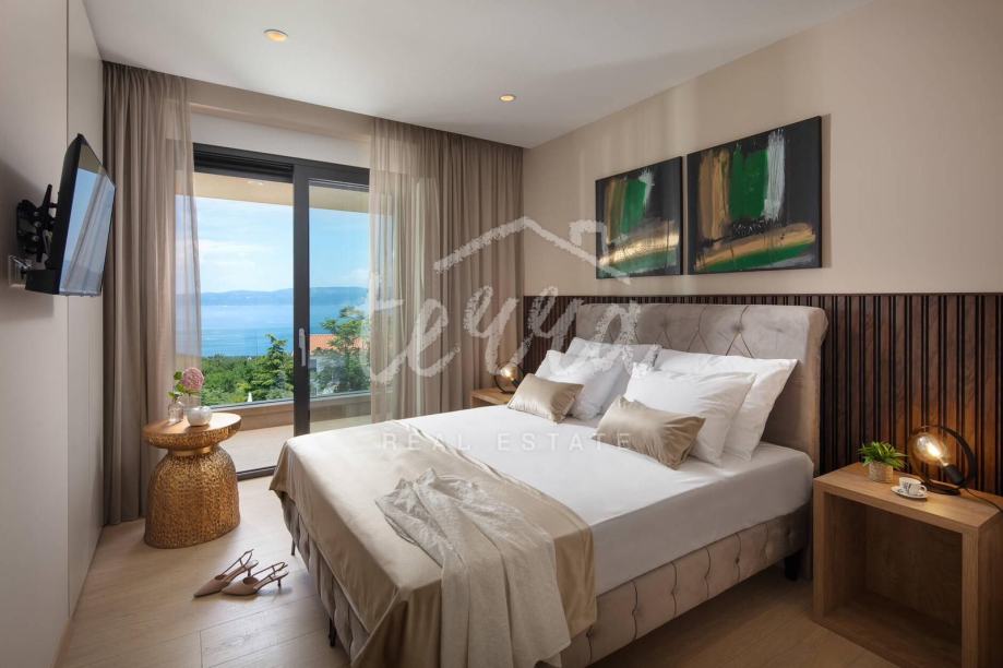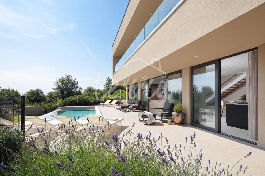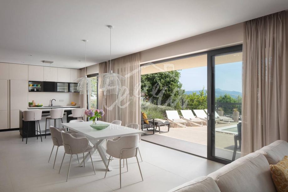Ova predivna luksuzna vila smještena je na parceli od 660 m2 u malom mjestu nedaleko Labina. Okružena je zelenilom koje se pruža sve do mora. Vila je površine 200m2 stambenog prostora te je potpuno opremljena dizajnerskim namještajem s naglaskom na detalje i luksuz. Nalazi se na idealnoj poziciji s prekrasnim neometanim pogledom na more, Kvarner, otoke Cres i Lošinj te Rijeku.