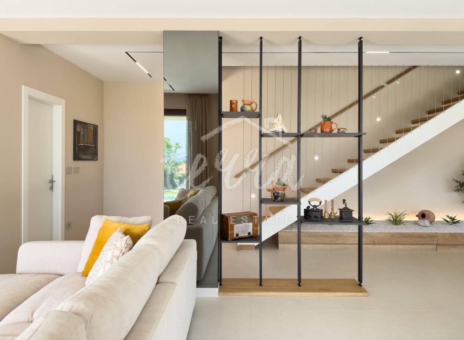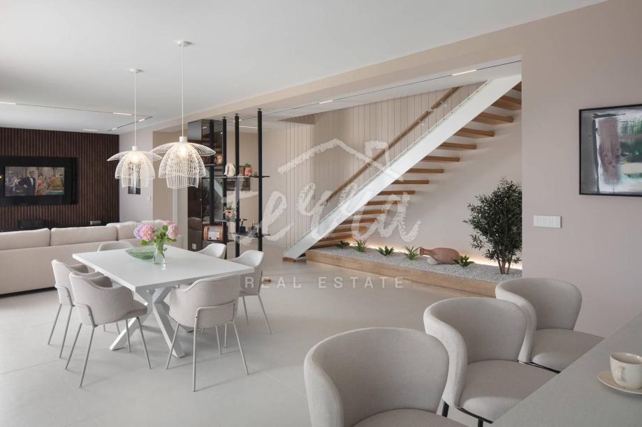 U prizemlju se nalazi moderna kuhinja sa blagovaonicom, veliki dnevni boravak, 2 spremišta, praonica i gostinjski wc. Velike staklene stijene protežu se uz duž fasade pa se stvara još bolji doživljaj povezanosti s prirodom. Izlazak iz vile vodi vas do popločane terase sa sunčalištem te preljevnim bazenom. U izgradnji je također i ljetna kuhinja te prostor za blagovanje i druženje.
