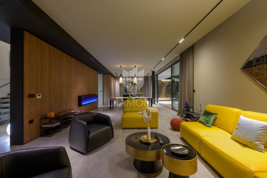 Vila se smjestila na zemljištu ukupne površne 2150m2. Vila se prostire na 300m2 koji su se podijelili na prizemlje i jedan kat. U prizemlju kuće nalazi se dnevni boravak opremljen luksuznim talijanskim namještajem od prave kože , kuhinja visoke kvalitete također talijanske izrade sa Nef ugradbenim uređajima, također ima prostor blagavaonice. Prostor kuhinje i dnevnog boravka rađen po principu open spacea iz kojih se izlazi na natkrivenu terasu površine 222m2 i plažu ukupne površine 160m2 , bazen dugačak 15 metara ( 61m2) sa slanom vodom te prostor za druženje. Uz rub bazena također se nalazi vanjska kuhinja koja je u potpunoti opremljena. U prizemlju kuće nalazi se wc, prostor za veš mašinu i peglanje.
