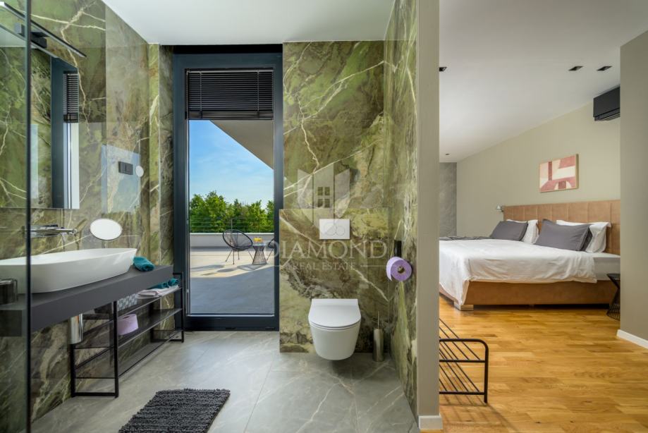 Mramornim stubištem dolazi se na kat kuće gdje se nalaze 3 luksuzno opremljene spavaće sobe Hespo program 5* od kojih svaka ima svoju kupaonicu koje su opremljene Hans Grohe i Axor opremom i zasebne terase. Sa svake terase pruža se predivni pogleda na prirodu koja oduzima dah.