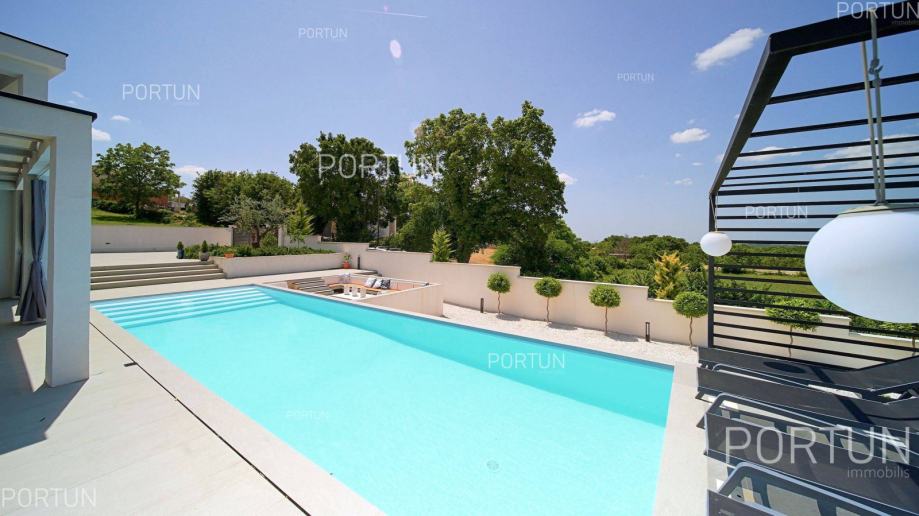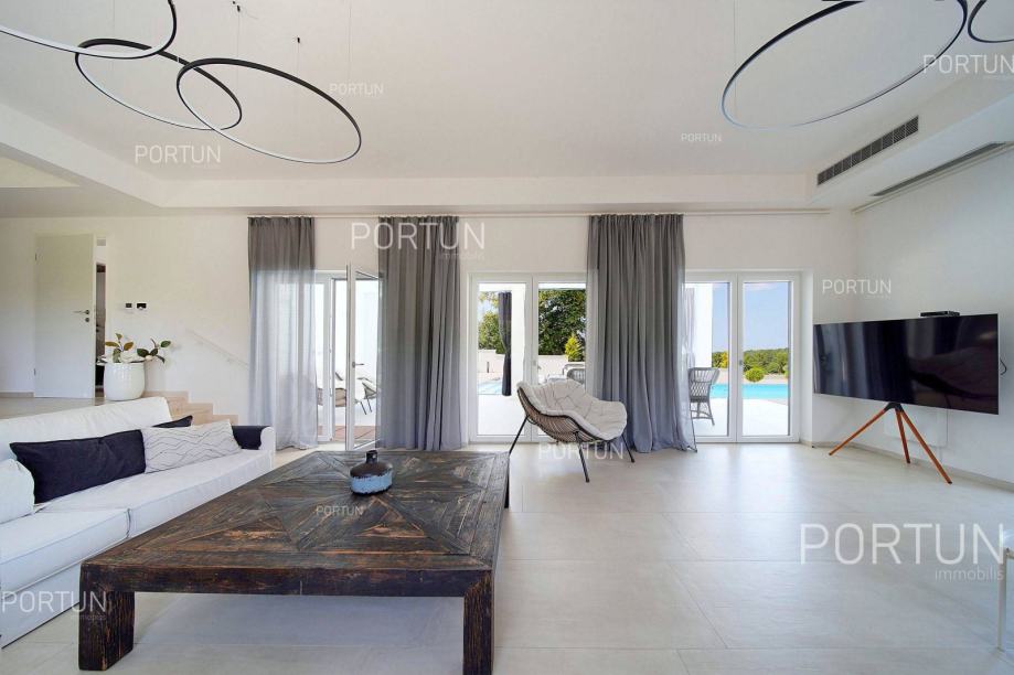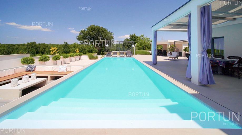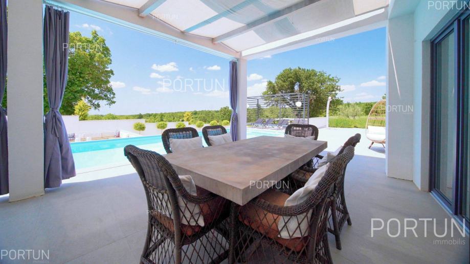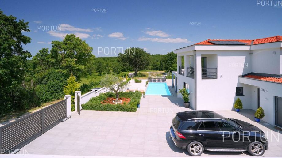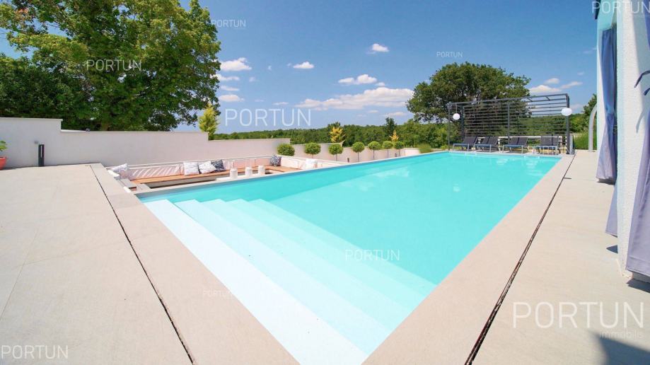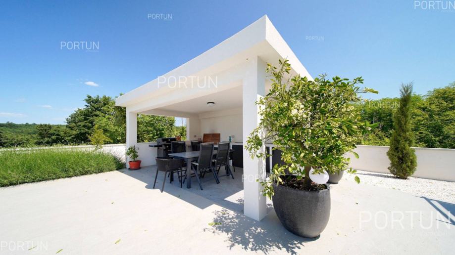 Suvremena vila sa četiri spavaće sobe, voluminoznim dnevnim boravkom i raskošnom zonom za opuštanje nalazi se u mirnom, seoskom ambijentu zapadne Istre te nudi pogled na more i zelenilo. Moderno uređen interijer nudi sav potreban komfor za 8-10 gostiju, a vanjski prostor je podijeljen u nekoliko zona za opuštanje i uživanje pod vedrim nebom. Prizemljem dominira svjetao i prozračan dnevni boravak uređen u neutralnim tonovima, kojega krasi minimalistička rasvjeta i moderan namještaj. Nekoliko stepenica iznad dnevnog boravka smješten je prostor za blagovanje i pripremu hrane. Vrhunski opremljena kuhinja u obliku slova L, moderno je dizajnirana, a u centru se nalazi kuhinjski otok s visećom napom. U prizemlju nalazimo još jednu spavaću sobu s kupanicom, wc i praonicu. Prvi kat je rezerviran za spavaće sobe, kojih ima tri, a svaka ima vlastitu kupaonicu, dok je glavna spavaća soba dodatno opremljena s velikom terasom iz koje se pruža pogled na more. Vanjski prostor suvremeno je uređen i traži minimalno održavanja, dok se istovremeno gostima nudi mogućnost boravka u različitim zonama. Središnji dio dvorišta zauzima pravokutan plavi bazen sa širokim stepeništem, a odmah uz njega nalazi se upuštena lounge zona koja je idealna za večernja druženja s prijateljima uz fire pit. Vrući dani mogu se provoditi u dubokoj hladovinu koju nudi natkrivena terase ili u prijatnoj sjeni koju nudi ljetna kuhinja. Ovdje se može pripremati razna jela na roštilju, uz neizostavno uživanje u istarskim vinima. Zaželite li se masaže i opuštanja u mjehurićima, dovoljno je izaći iz dnevnog boravka i možete se osvježiti u hidromasažnoj kadi. Radi smanjenja potrošnje električne energije na krov su postavljeni fotonaponski paneli ukupne snage 10,7 kW, a kuća je opremljena sa sustavom za omekšanjem vode. Ukratko, ova vila na rubu malog sela u blizini Kanfanara nudi mirno okruženje u prirodnom ambijentu. Sadrži četiri spavaće sobe s vlastitim kupaonicama, pogled na more s prvog kata, prostrani dnevni boravak s velikim staklenim otvorima, natkrivenu terasu s ljetnom kuhinjom, dugi bazen sa sunčalištem, vanjski prostor za druženja, modernu kuhinju s otokom, dnevni boravak s kaminom, privatni parking za pet automobila te potencijal za ulaganje u nekretnine i ljetni turistički najam.KLJUČNE OSOBINE✔ Mirno selo na području Rovinja✔ 4 Spavaće sobe │ 4 Kupaonice │ 1 WC✔ Zemljište 984 četvornih metara✔ Skimerski bazen 48,00 m2✔ Hidromasažna kada Jacuzzi │ 6 Osoba✔ Izgrađeno 2022. g.