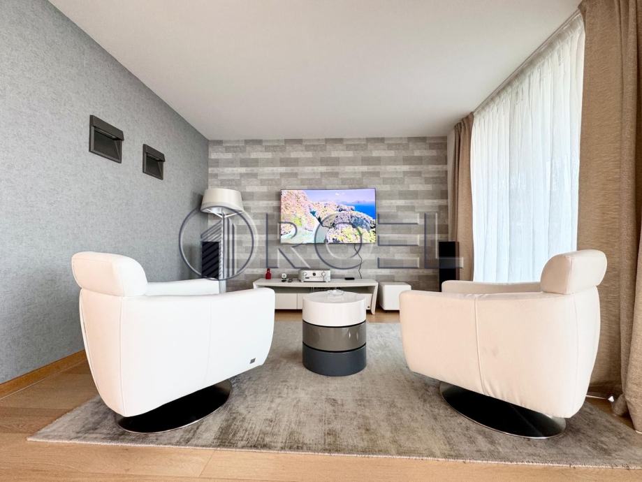 Na prvom katu smješten je prozračni open space dnevni boravak s modernom kuhinjom i blagovaonicom, kupaonica, te izlaz na velike terase s neometanim pogledom na more. Kat dodatno obuhvaća dvije luksuzne spavaće sobe s vlastitim kupaonicama, garderobu, gostinjski toalet i spremište.