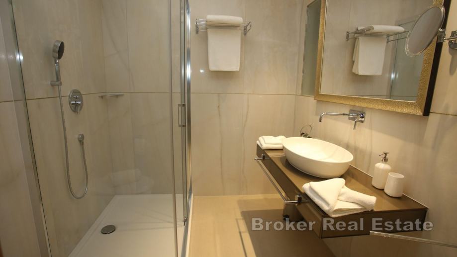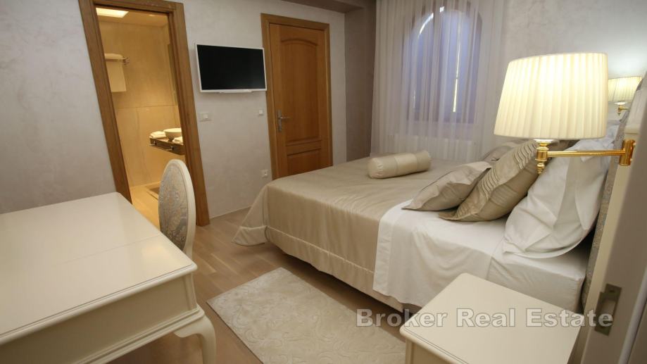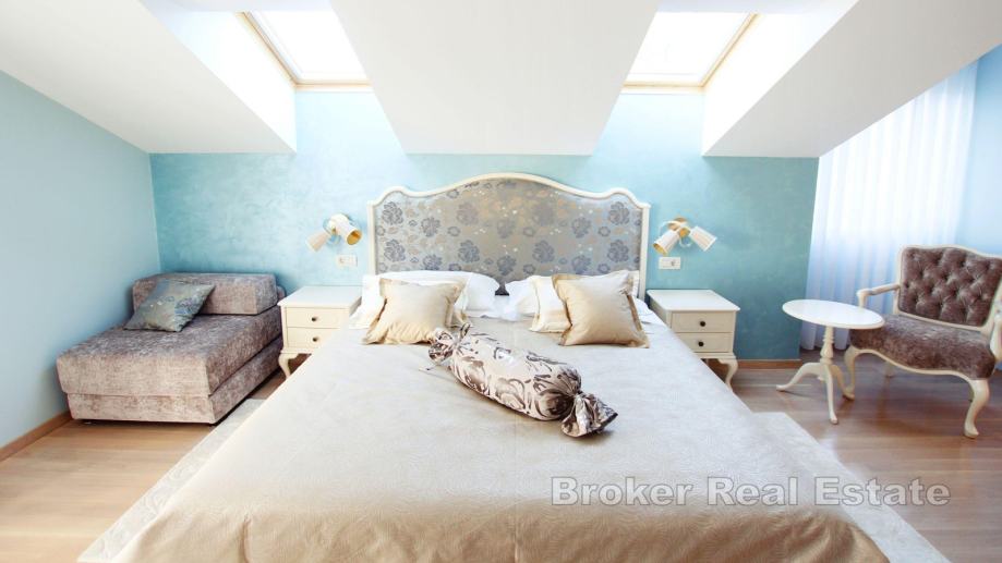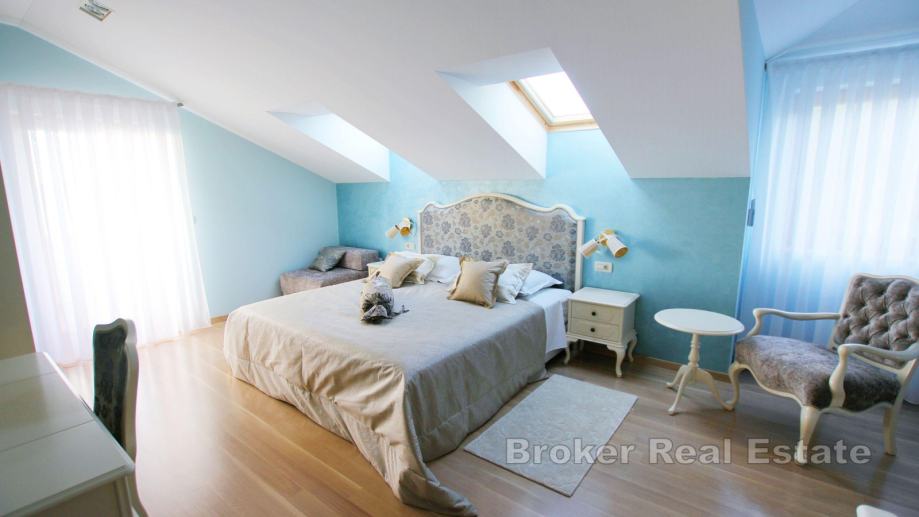 Na prizemnoj etaži nalazi se garaža koja se trenutačno koristi kao prostorija za zabavu, zatim dvije spreme te toalet. Na prvom katu smještena je prva jedinica koja je u naravi dvosoban stan koji se sastoji od kuhinje, blagovaonice i dnevnog boravka iz kojih se pruža pogled na more i izlaz na dvije terase. Na istoj etaži smještene su još i dvije spavaće sobe i dvije kupaonice. Na drugom i trećem katu je smještena je druga jedinica koja se sastoji od otvorenog dnevnog dijela koji se sastoji od kuhinje s blagovaonicom i dnevnog boravka, kupaonice, radne sobe te dvije lođe i balkona na prvoj etaži te predsoblja, tri spavaće sobe i tri kupaonice i balkona na drugoj.