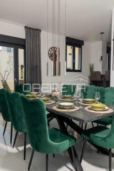 U prizemlju se nalazi prostrani dnevni boravak s blagovaonicom i kuhinjom, spavaća soba, luksuzna kupaonica, WC, hodnik i ostava. Iz dnevnog boravka izlazi se na natkrivenu terasu, savršenu za uživanje u mediteranskom okruženju. Na prvom katu smještene su još dvije spavaće sobe, svaka s vlastitim luksuzno opremljenim kupaonicama i izlazom na jednu od dvije terase, idealne za opuštanje uz nezaboravan pogled te radnom sobom.